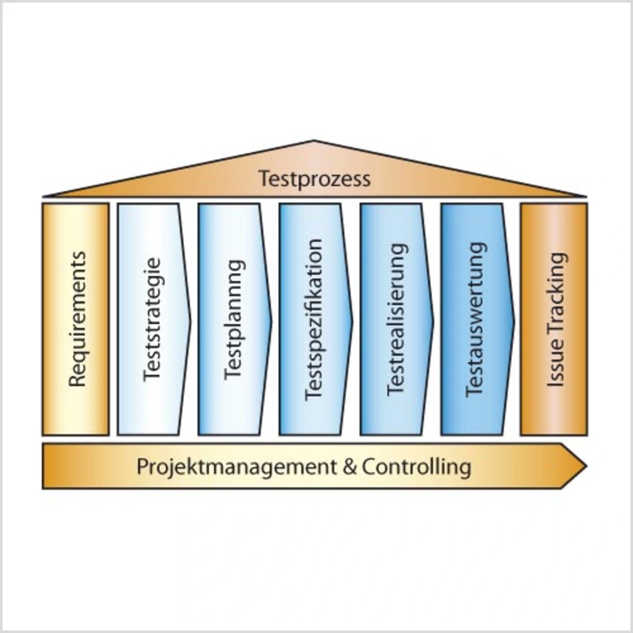Basierend auf den genannten Anforderungen, wird in diesem Abschnitt die Struktur des Modells PROVEtech:TP5 – einem Testprozess bestehend aus fünf Hauptphasen, in Bild 1 blau dargestellt – zur Analyse und Bewertung des Testprozesses vorgestellt [5].