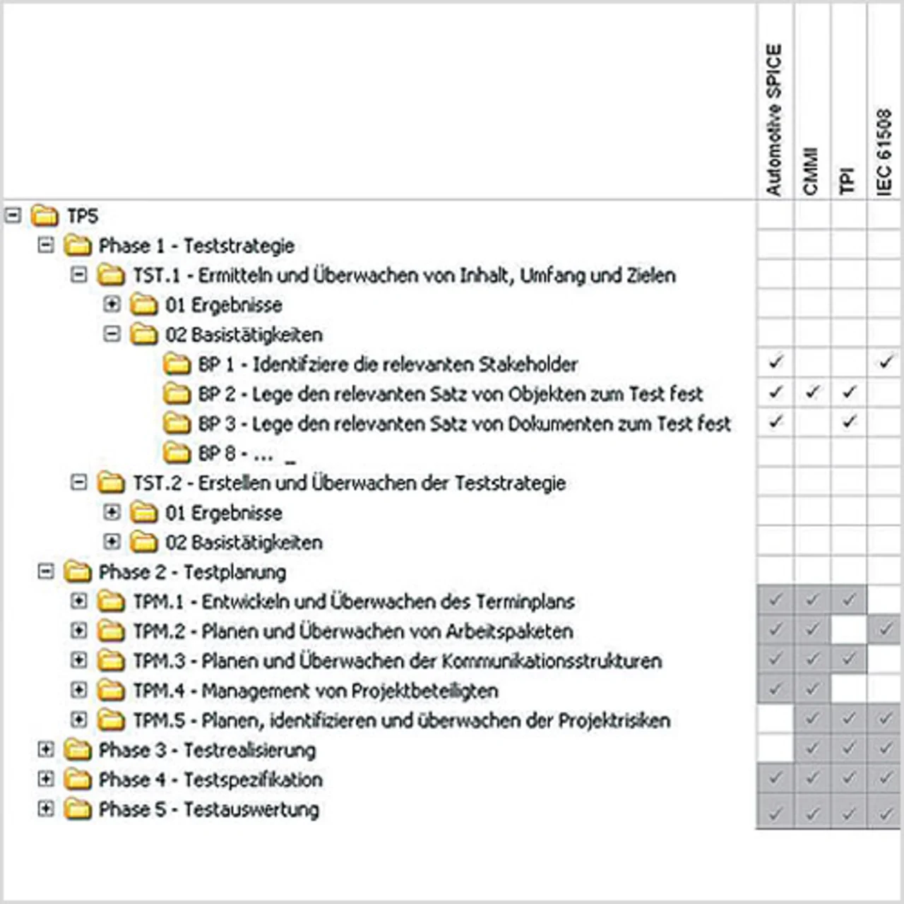 Die konsequente Zuordnung von Prozessen, Ergebnissen, Zielen oder Anforderungen anderer Prozessmodelle auf PROVEtech:TP5 ermöglicht eine Skalierung des Modells. Es können also genau die Prozesse, Ergebnisse und Basistätigkeiten von PROVEtech: TP5 ausgewählt und angewendet werden, die zur Erfüllung relevanter weiterer Prozessmodelle benötigt werden, etwa IEC 61508 oder firmenspezifische Vorgehensmodelle (Bild 2).