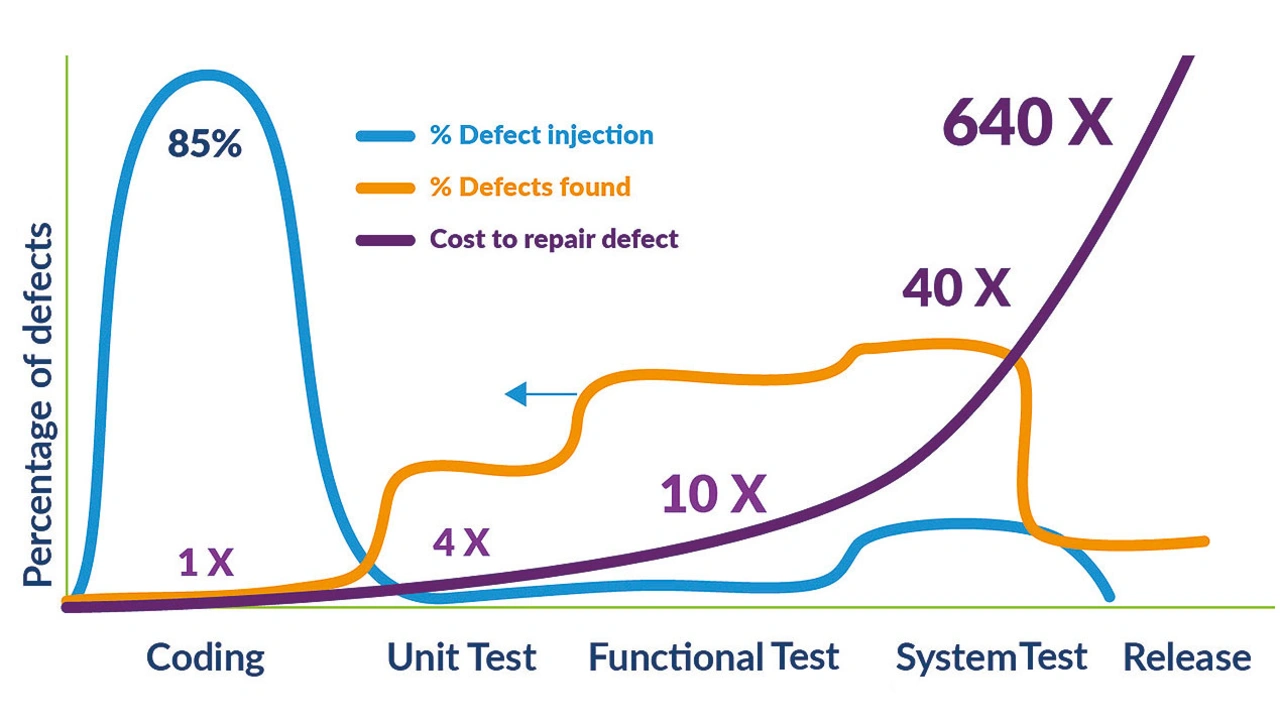 ➔ Zeitlich vorverlegtes (Shift-Left-)Testen: Durch frühzeitiges und häufiges Testen treten weniger Bedrohungsvektoren, Fehler und Probleme im eigenen Arbeitsablauf auf. Fehler werden früher aufgedeckt, das führt zu einfacheren Korrekturen, kürzeren Bereitstellungszeiten und niedrigeren Projektkosten (Bild 2).