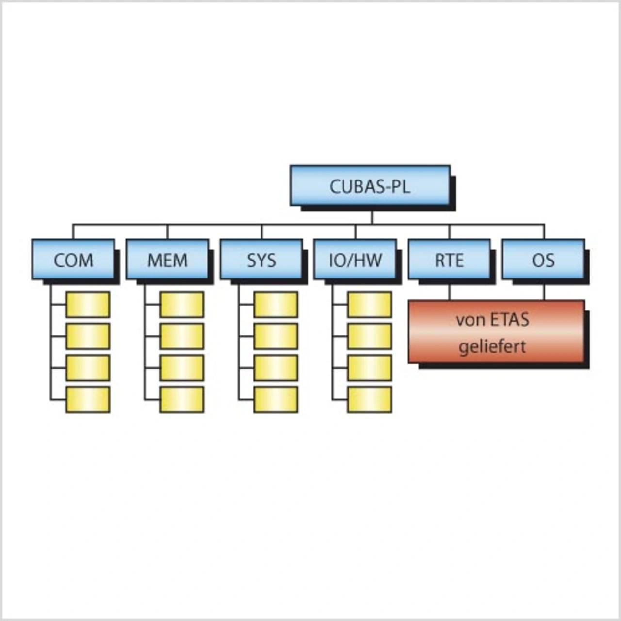 Die AUTOSAR-Basis-Software von Bosch wird in die in Bild 4 dargestellten Abliefereinheiten unterteilt: Kommunikation (COM), Speicher (MEM), Systemservice (SYS), E/A-Hardware-Abstraktion (IO/HW), Laufzeitumgebung (RTE) und Betriebssystem (OS). Wobei AUTOSAR OS und RTE von der ETAS GmbH eingesetzt werden.