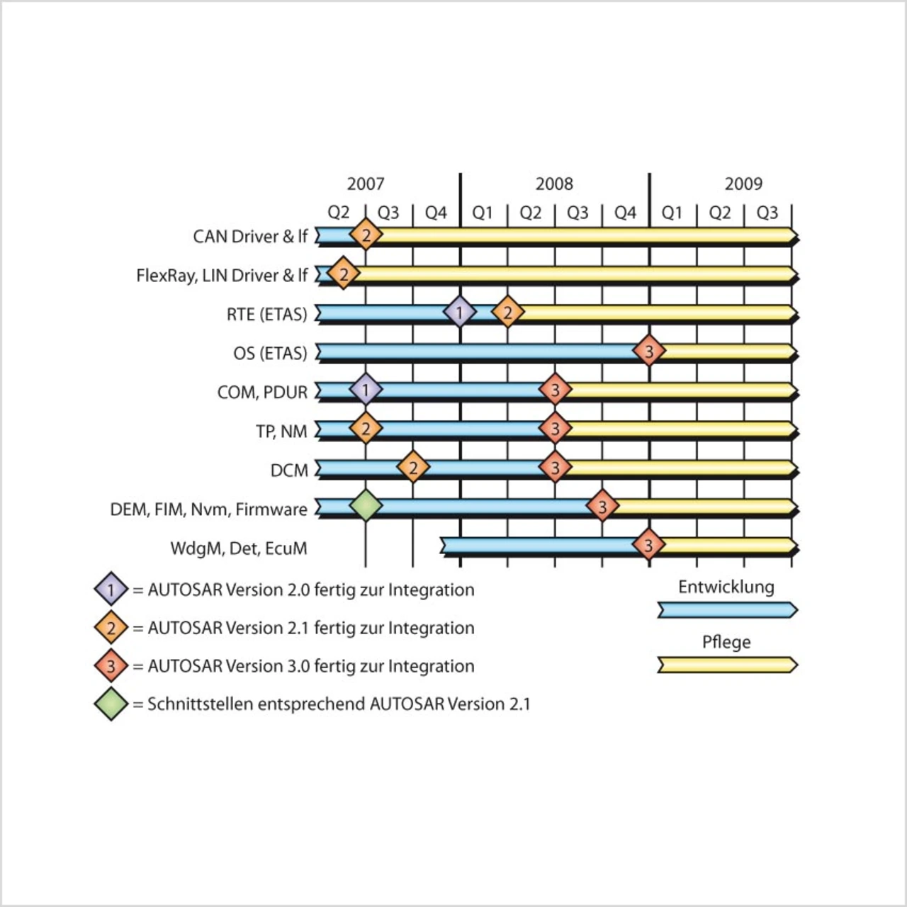 Die Mikrocontroller Abstraction Layer (MCAL) soll vom jeweiligen Halbleiterhersteller zugeliefert werden. Bild 5 zeigt die Verfügbarkeit der Module der Bosch-Basis-Software für die Integration in Serienprojekte. Die Planung für CUBAS Version 3.0 basiert auf der Verfügbarkeit von AUTOSAR Version 3.0 Ende 2007.
