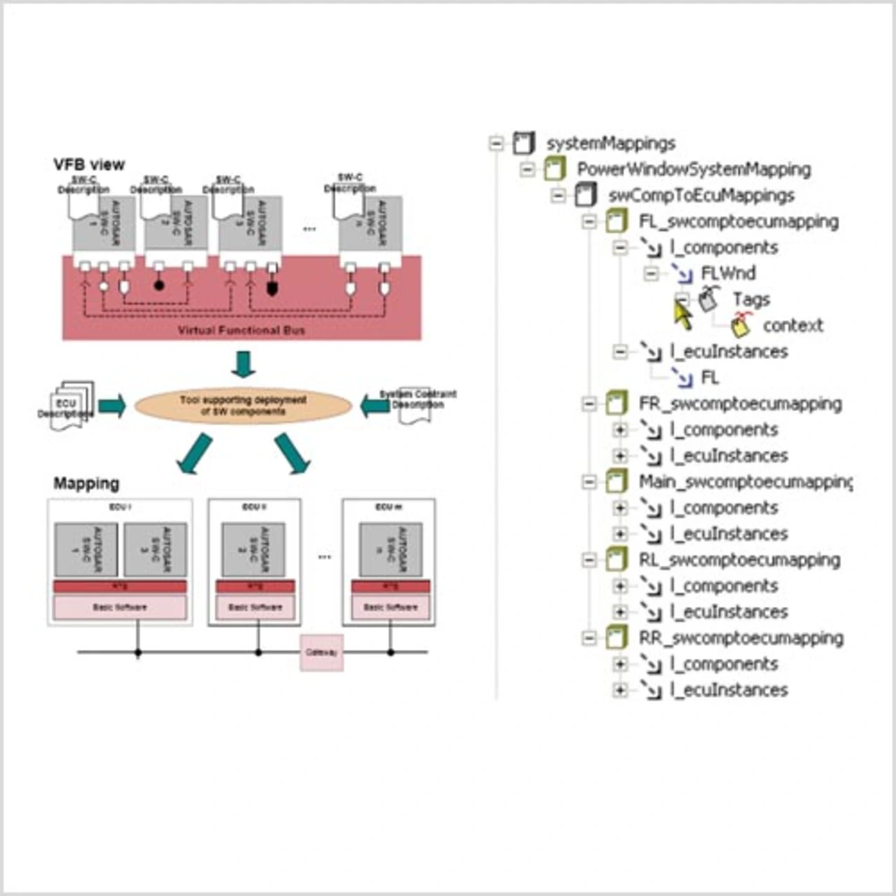 Auch die Beschreibung der elektrischen Architektur des umgebenden Fahrzeugs findet im AUTOSAR-Prozess statt. Dazu kommt eine Kombination von ECU-Diagramm und Topology- Diagramm zum Einsatz. Diese basieren auf den Klassen- und Objektdiagrammen in UML/SysML, und mit ihnen lassen sich die Steuergeräte, ihre Ports sowie die CAN-, LIN-, FlexRay- oder MOST-Bussysteme beschreiben, über welche die Steuergeräte miteinander verbunden sind. Der letzte Schritt bei der Erstellung eines Systemmodells ist die Definition der Abbildung der Softwarekomponenten auf die Steuergeräte im Topology- Diagramm. Im Systemdiagramm wird für jede SW-C, die im Software-Component-Diagramm beschrieben wurde, festgelegt, auf welchem Steuergerät im umgebenden Fahrzeug (wie im ECU-Diagramm definiert) sie zu implementieren ist. Nachdem diese Zuordnung beschrieben ist, lässt sich die Kommunikationsmatrix herleiten.