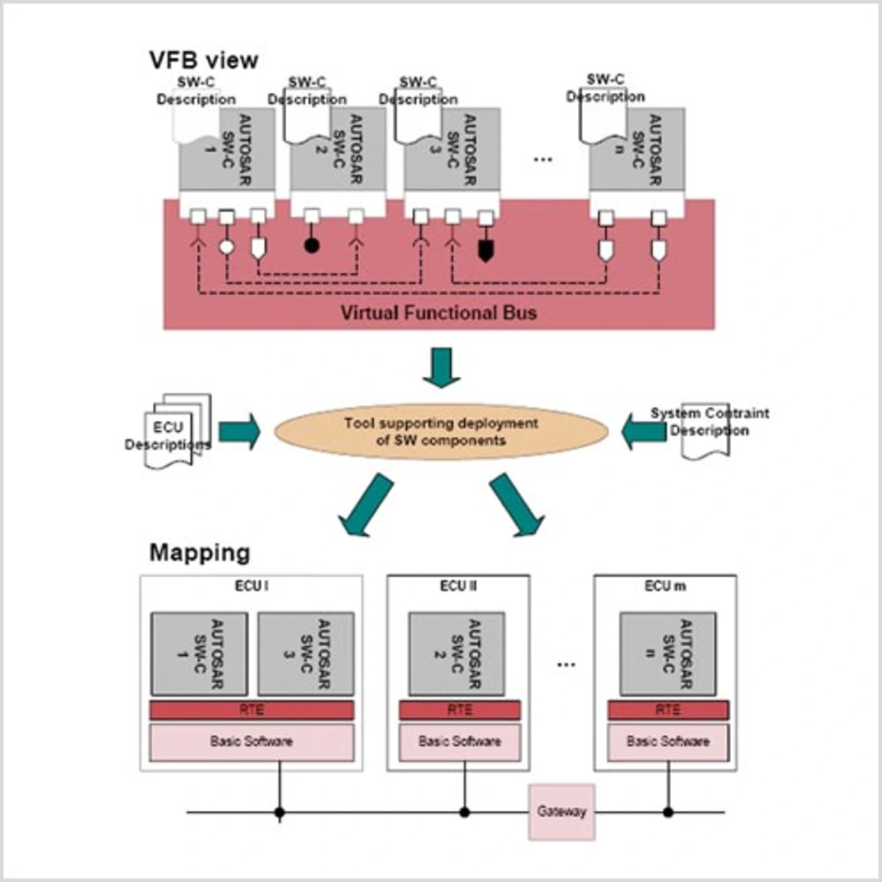 AUTOSAR versteht ein System als eine Menge von Softwarekomponenten (SW-Cs), die miteinander über einen »Virtual Functional Bus« (VFB) kommunizieren und interagieren. Abgebildet werden die SW-Cs auf spezifische Steuergeräte (ECUs, Electronic Control Units), welche über das Netzwerk verteilt sind. Dank einer in Schichten angelegten Architektur lassen sich die SW-Cs auf andere Plattformen übertragen, ohne dadurch die funktionale Integration zu beeinträchtigen. Der Vorteil: AUTOSAR-konforme Komponenten, die sich bewährt haben, lassen sich ohne langwierige und fehleranfällige Anpassungen auf eine andere Zielumgebung portieren.