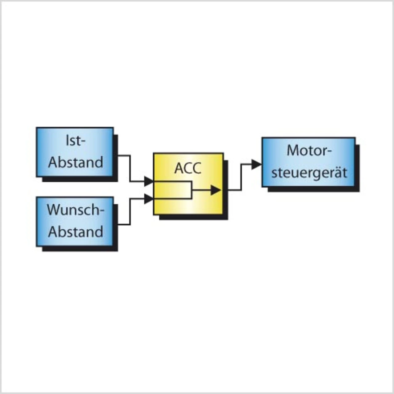 Die Konsistenz fordert im Beispiel „ACC-Regelanlage“, dass diese aus den beiden Eingaben des Wunschabstands und des aktuellen Abstands eine Sollbeschleunigung berechnet (Bild 4). Das heißt, dass die innere Struktur der ACC eine Abhängigkeit zwischen den beiden eingehenden Informationsflüssen und dem ausgehenden Informationsfluss aufweist – und damit zwischen den Eingängen und dem Ausgang.