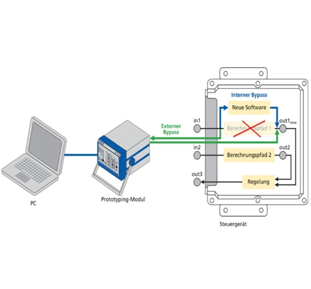 Beispielfall 1, klassischer externer Bypass für Rapid Prototyping: Das Prototyping neuer Algorithmen ermöglicht das effiziente Entwickeln von Spezifikationen für Steuerungsfunktionen (Bild 2). Diese werden über Freischnitte integriert. Die Möglichkeit, dass der Fahrzeughersteller Freischnitte nach der Software-Ablieferung durch den Lieferanten selbst einsetzt, kann Entwicklungszeiten verkürzen und Kosten reduzieren. In einigen Fällen konnte durch die Verwendung von EHooks die benötigte Zeit, bis ein neuer Freischnitt verfügbar ist, von mehreren Monaten auf wenige Minuten verkürzt werden, da nicht auf einen neuen Software-Stand des Zulieferers gewartet werden muss.
