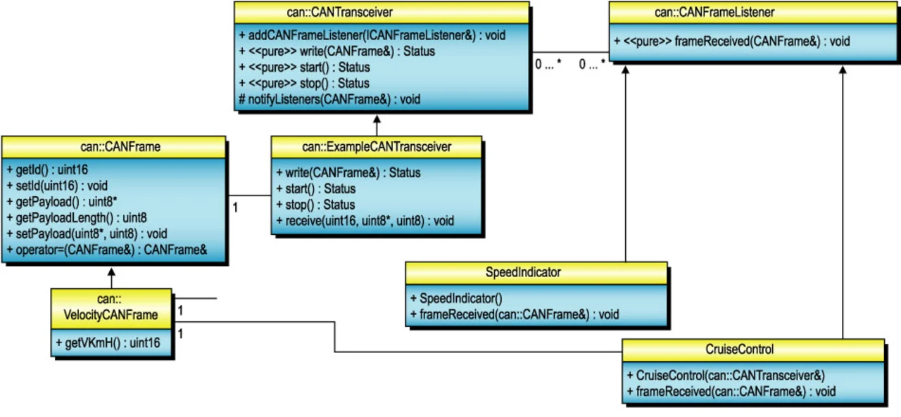 Im Folgenden wird ein (stark vereinfachtes) Framework für Embedded-Anwendungen mit Kommunikation über den in der Automobilindustrie weit verbreiteten CAN-Bus (Controller Area Network) entwickelt und einige Details von C++ anhand dieses Beispiels erläutert. Bild 1 zeigt das UML-Klassendiagramm des Szenarios.