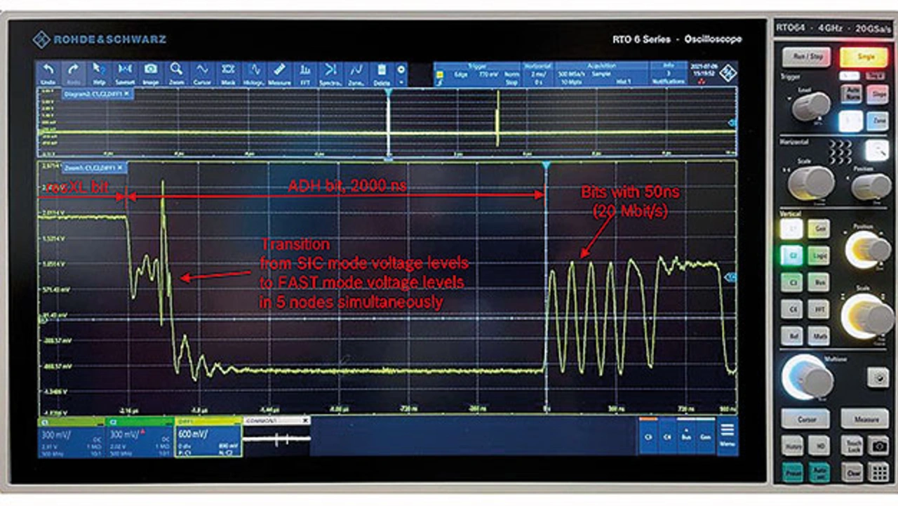 Um den Anwendern das Evaluieren bezüglich des »Ringings« auf den Netzwerkleitungen zu vereinfachen, erfolgt die Umschaltung von der langsamen Arbitrierungsphase (maximal 1 Mbit/s) zur schnellen Dataphase (10 Mbit/s und mehr) in zwei Schritten (zuerst von TxD dominant zu Level-0 und wenn das differenzielle Signal stabil ist zu Level-1). Die beiden Spannungshübe sind so geringer und führen deshalb zu weniger Überschwingern. Gleiches gilt für das Abbremsen am Ende des CAN-XL-Rahmentelegramms (zuerst von Level-1 zu aktiv rezessivem Netzwerksignal und dann zu dominantem Signal).