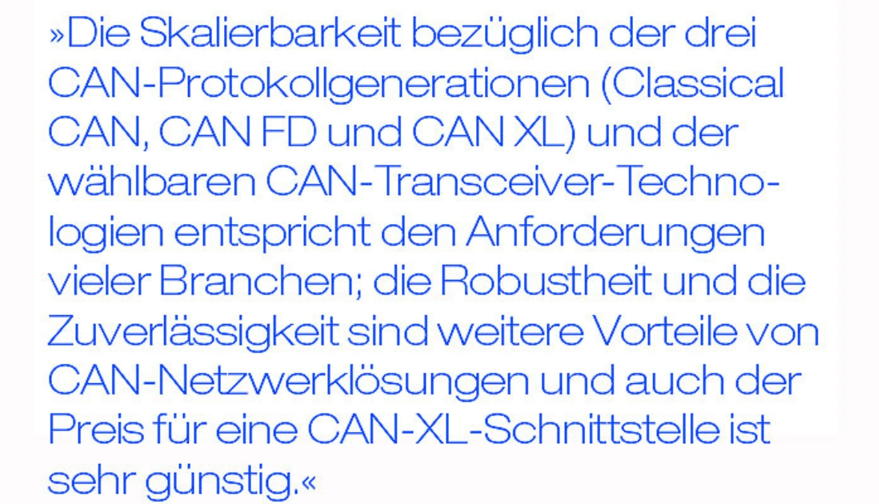Innerhalb von 30 Jahren hat sich CAN in Automation zu einem allgemeinen CAN-Verband gemausert, der alle Anwendungsgebiete abdeckt. Dies umfasst insbesondere Straßenfahrzeuge, Off-Road-Fahrzeuge, Eisenbahnen, Schiffe, Flugzeuge sowie Drohnen und sogar Satelliten. Mit der Entwicklung von CAN XL ist der eingetragene Verein nun auf neue Anforderungen vorbereitet.