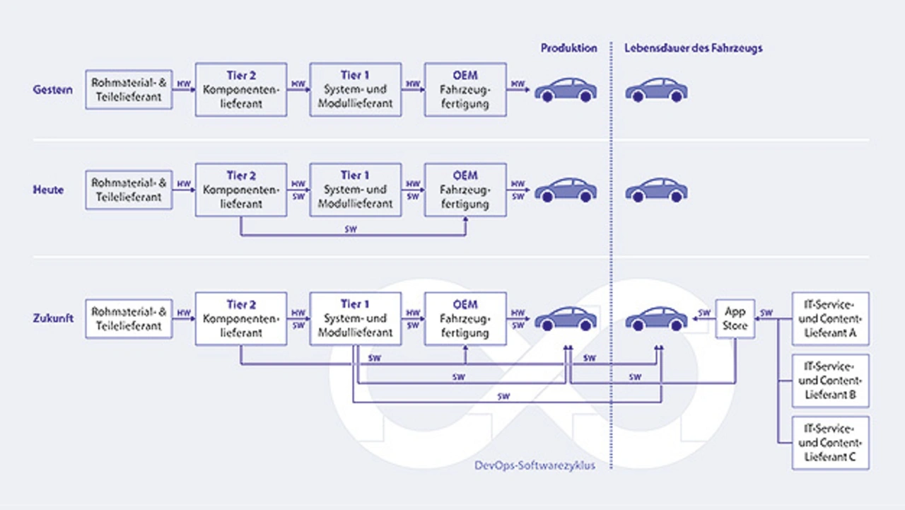 Die Entkopplung von Hard- und Software im Software-definierten Fahrzeug bewirkt eine entscheidende Veränderung: Der Entwicklungszyklus des SDV erstreckt sich damit über die gesamte Lebensspanne des Fahrzeugs. Während in der Vergangenheit jeder Schritt der Entwicklung in sich abgeschlossen war und einer fest definierten Reihenfolge im traditionellen V-Entwicklungsmodell folgend mit Start-of-Production (SOP) endete, wird künftig für das Fahrzeug im Feld ein kontinuierlicher Cloud-basierter Prozess von Softwareentwicklung und -erneuerung entlang des DevOps-Zyklus stattfinden (Bild 2).