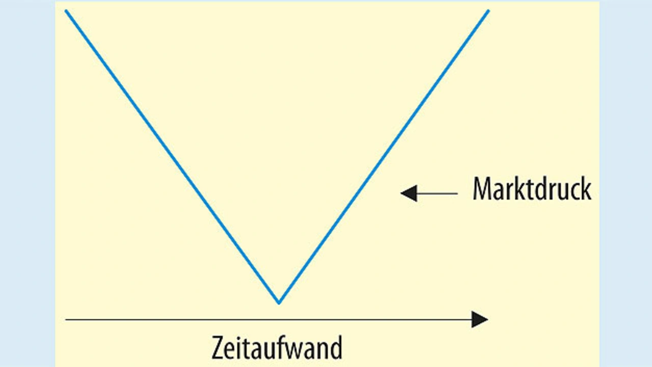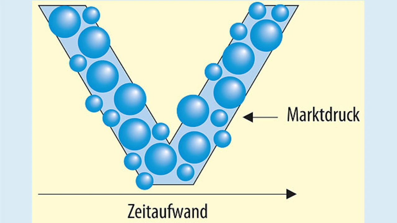 Bei der traditionellen Systementwicklung nach dem V-Modell werden die Anforderungen von der Kundenseite (Voice of the Customer) links oben, durch die verschiedenen Ebenen des Systems, der Subsysteme und letztlich der Komponenten immer tiefer detailliert; auf der rechten Seite des „V“ werden sie aufgebaut und validiert. Wenn die Zeit die x-Achse bildet, dann wird der Marktdruck von rechts nach links ausgeübt (Bild 1).