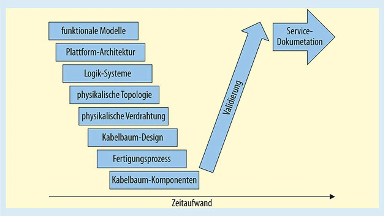 Daraus ergibt sich eine physikalische Verdrahtung, welche zum Beispiel mit dem Kabelbaumdesign synchronisiert wird. Dieser Zwischenschritt wird dann für die Assemblierung des Kabelbaums weiter detailliert, was letztlich zur Fertigung eines realen Kabelbaums führt. Eine Serviceorganisation kann anhand all dieser Daten Servicedokumente und Störungsbeseitigungs-Verfahren für ihre Techniker im Feld erstellen (Bild 5).