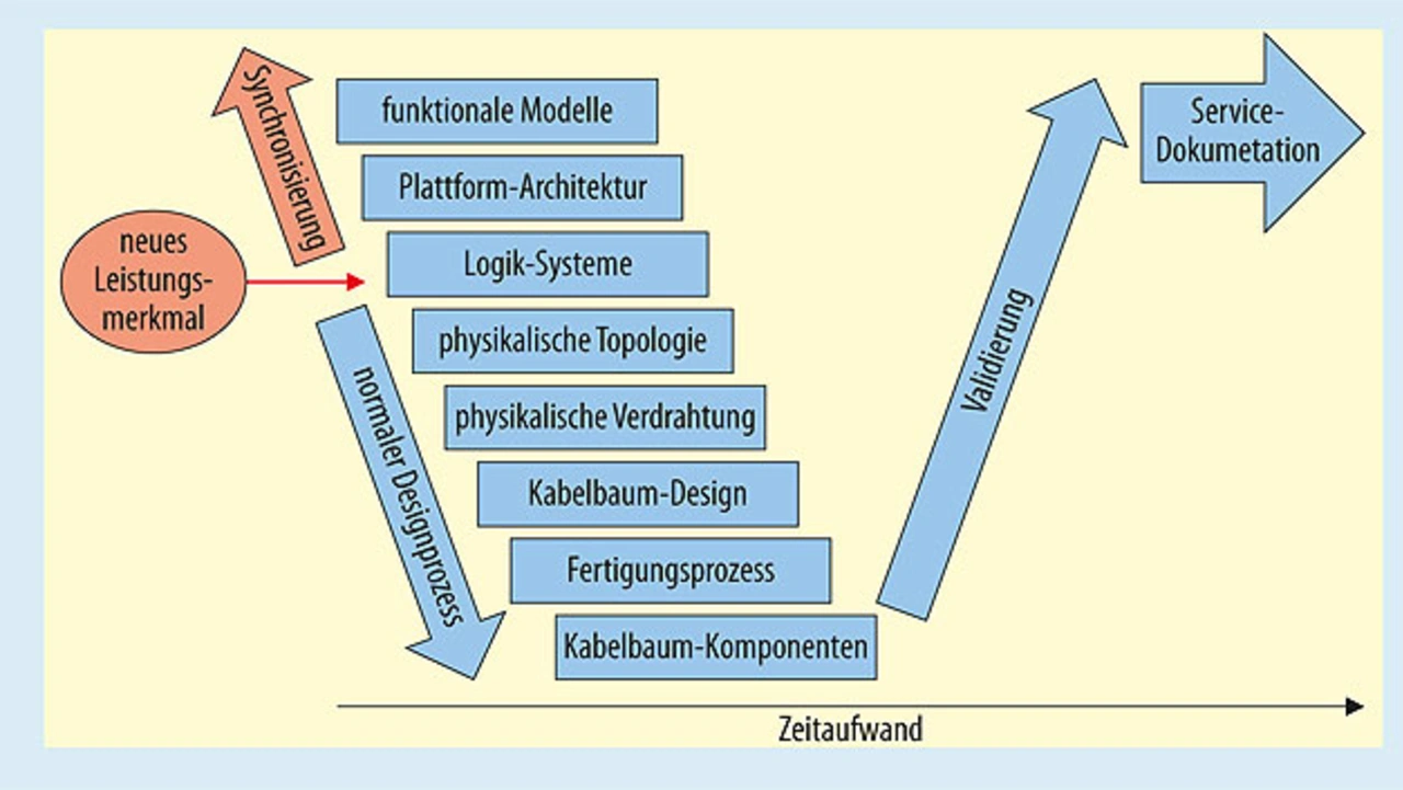 Um neue Funktionen schnell implementieren zu können, müssen diese an der richtigen Stelle im V-Modell eingefügt und die Änderungen dann mit dem Rest der Designorganisation auf eine kontrollierte Weise synchronisiert werden. In der Regel beginnt man an der linken oberen Seite des Prozesses mit der funktionalen Modellierung. Diese wird für eine Plattformarchitektur verwendet, die zur Entwicklung von logischen Systemen führt, welche wiederum für die physikalische Topologie einer Plattform zum Einsatz kommen.