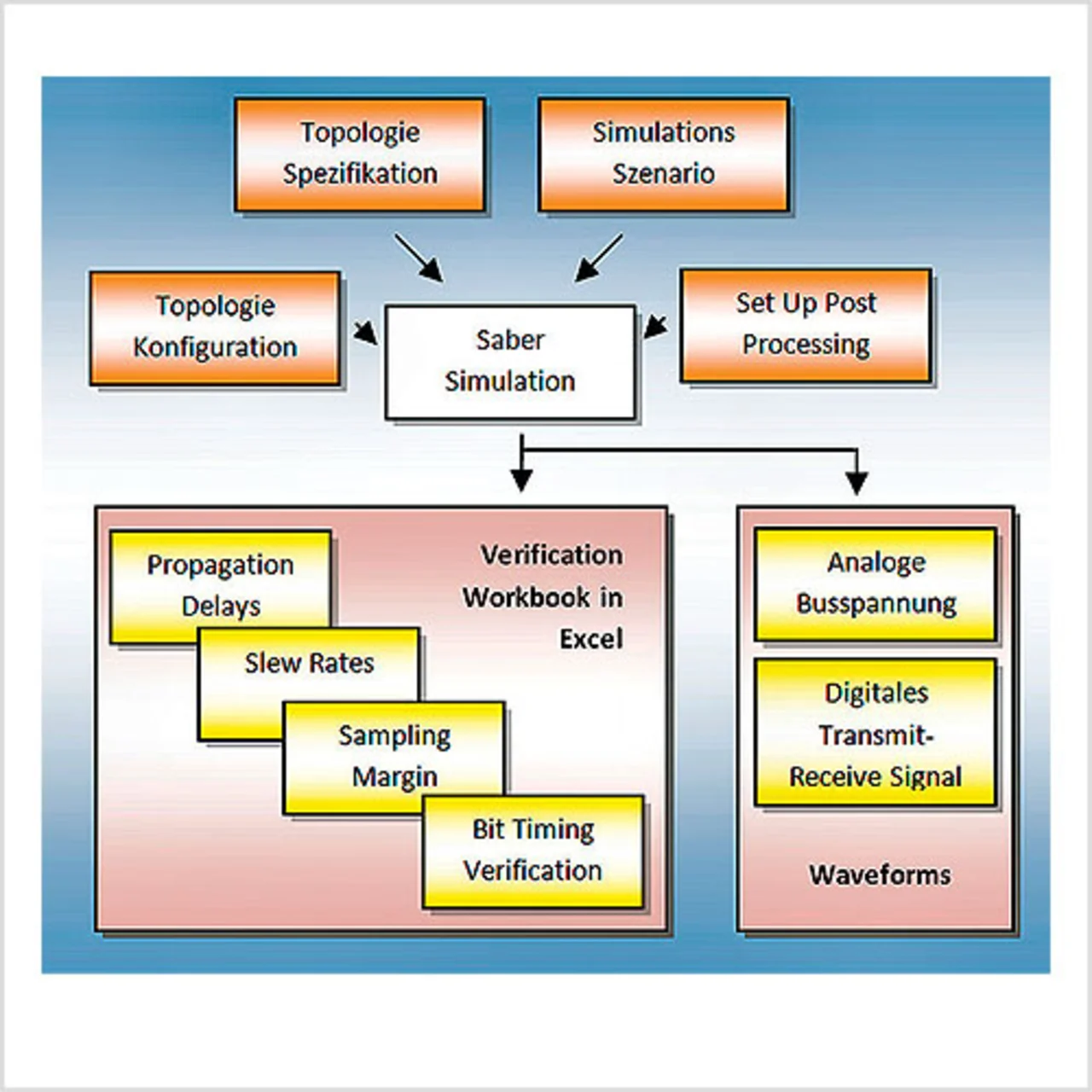 Bild 5 skizziert den gesamten Evaluierungsablauf für eine Topologie unter Einsatz von Automatisierungstechniken. Im ersten Schritt legt der Entwickler die Topologie fest. Zu dieser werden dann entsprechende Konfigurationen definiert, z.B. die Einstellungen für Terminierungen, Drosseltypen, Transceiver, kapazitive Schutzbeschaltungen usw. Sämtliche Einstellungen werden in so genannten Experimenten abgelegt. Sie beinhalten auch die Definition der Simulationsszenarien, z.B. Round Robin mit Einzelbit oder Einzeldurchlauf mit Acknowledgement. Im Anschluss definiert der Netzwerkentwickler noch die Messungen, die für die Bewertung der Topologie benötigt werden – z.B. Propagation Delays oder Flankensteilheit. Nach der Definition wird das Experiment gestartet, nach durchlaufener Simulation werden die Daten automatisch in ein Excel Workbook übertragen. Das generierte Excel Workbook erlaubt einen Überblick über die zu analysierenden Kriterien. Für tiefer gehende Analysen stehen dem Entwickler zusätzlich zu den generierten Tabellen neben sämtlichen simulierten analogen Busspannungen auch digitale Signale, z.B. vom CAN-Controller, per Default zur Verfügung. Bei auftretenden Topologie-Problemen kann so eine Analyse bis hinunter auf die Ebene der einzelnen Zeitquanten des Bit-Timings durchgeführt werden. go