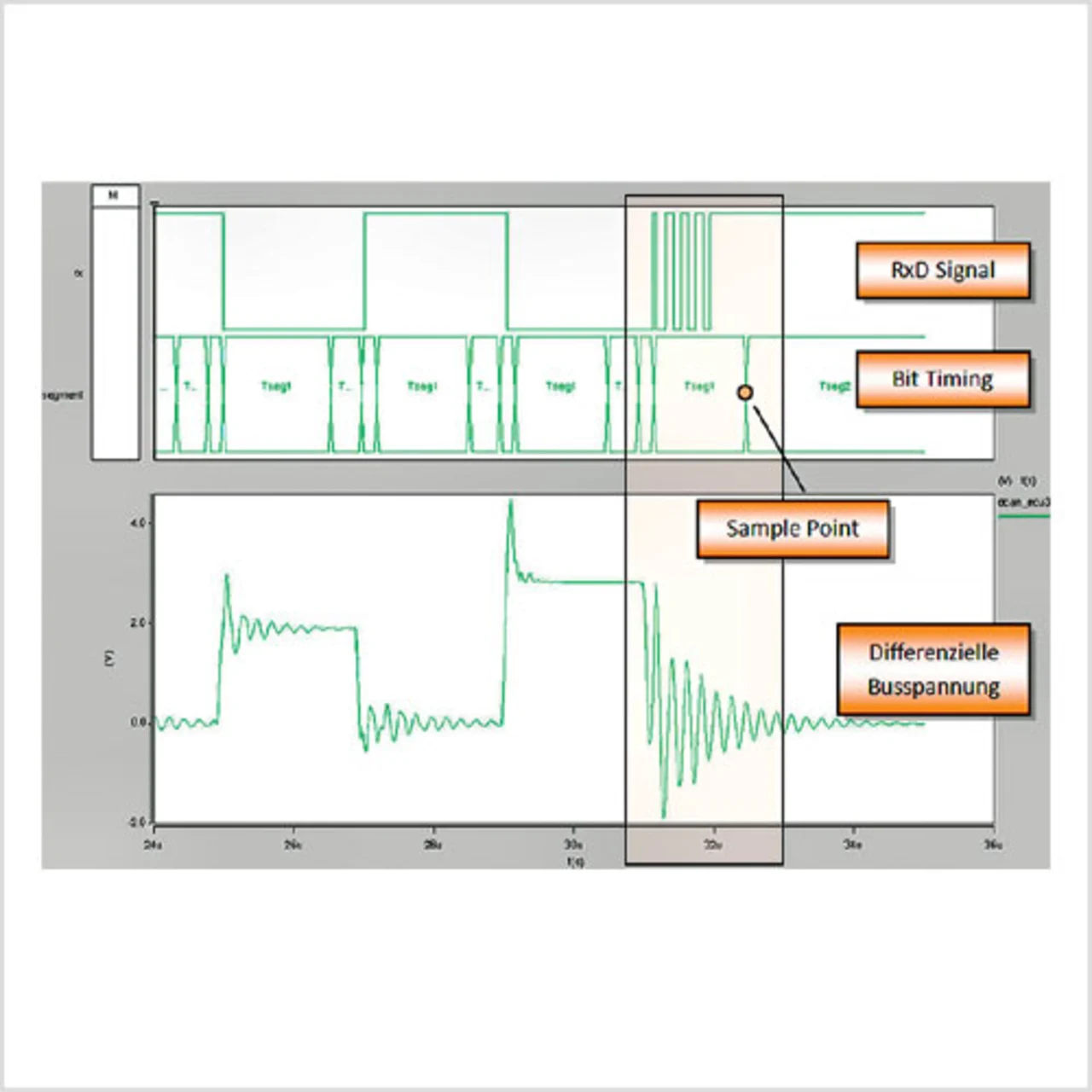 Mit Hilfe der Simulation liegen dem Entwickler nun unmittelbar die benötigten Daten vor, um die Topologie in ihrer Qualität bewerten zu können. Das ist möglich, obwohl noch kein Hardware-Prototyp vorliegt. Aus den simulierten Daten lassen sich nun Punkte wie Flankensteilheit, Propagation Delays oder auch Einschwingdauer bewerten. Ein weiteres Highlight, welches über den rein analogen Anteil der simulierten Busspannungen hinausgeht, sind die Daten aus dem Bit-Timing. Mit Hilfe des Controller-Modells ist es dem Entwickler auch möglich, das Bit-Timing zu verifizieren. Letzteres kann bequem im Controller-Modell eingestellt und unmittelbar mit der gesamten Topologie validiert werden. Neben der analogen Busspannung hat der Entwickler Zugriff auf das digitale Receive-Signal (RxD), den Verlauf des Bit-Timings und sämtliche controllerinternen Signale. Hieraus lässt sich z.B. unmittelbar ablesen, wie nah sich der Abtastzeitpunkt des Controllers am kritischen Gebiet befindet, in dem signifikantes Ringing auftritt. In Bild 4 sind deutlich die mehrfachen Signalwechsel des Receive-Signals zu erkennen. Der Abstand der letzten Flanke zum Abtastzeitpunkt (Sample-Point) liefert eine genaue Information, wieviel Reserve noch vorhanden ist. Gerät der Sample-Point zu nah an dieses Gebiet, können Fehlabtastungen auftreten.