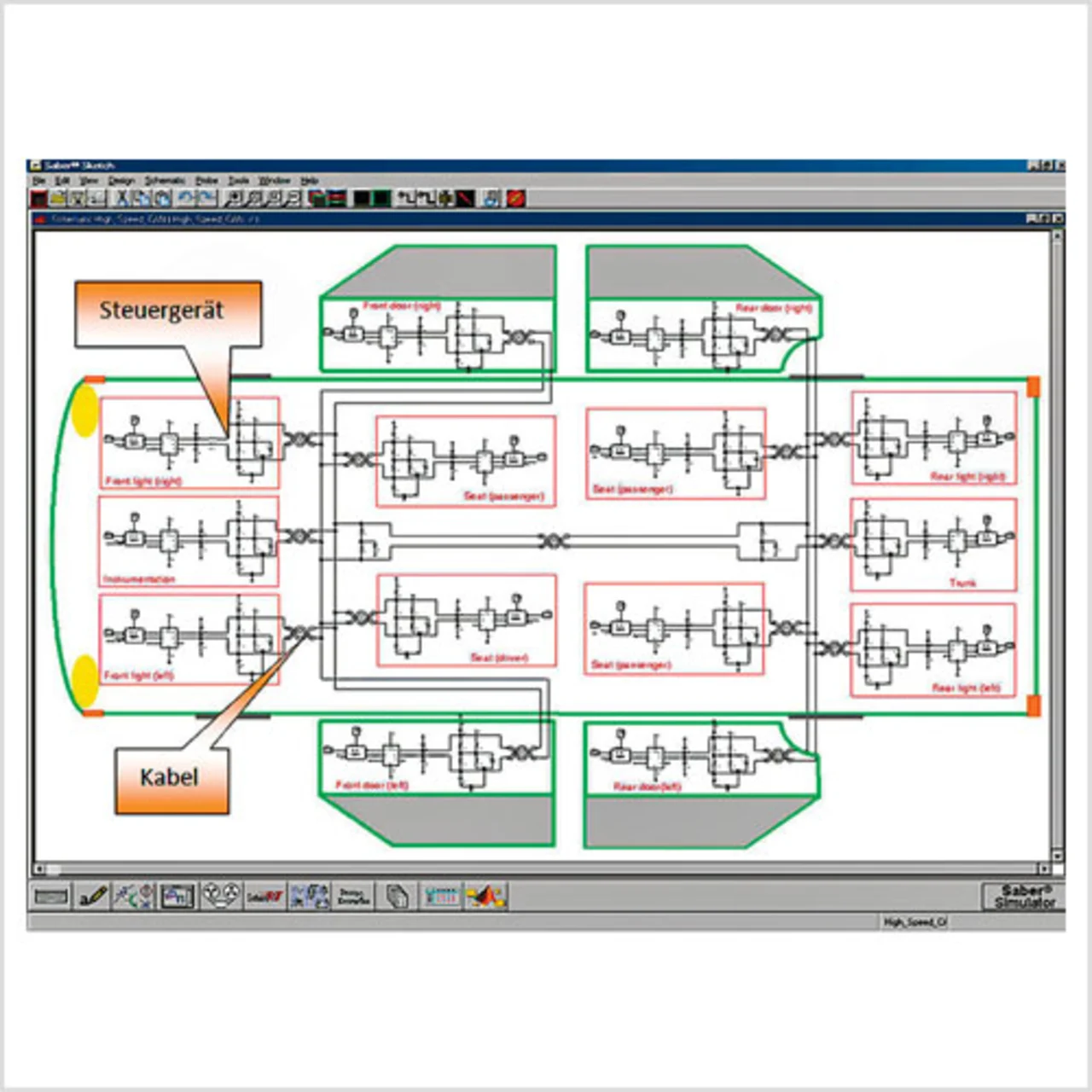 Zu diesem Zeitpunkt der Entwicklung existiert die Topologie aber nur auf dem Papier und Messungen sind nicht verfügbar. Um dieses Problem zu lösen, setzen Automobilhersteller mittlerweile auf die modellbasierte Entwicklung. Sie erfordert eine Entwicklungsumgebung, die die Erstellung virtueller Prototypen der Topologien ermöglicht. Diese dienen dem Entwickler als ausführbare Spezifikation. Sie erlauben es schon in der Spezifikationsphase der Vernetzung, die Topologien detailliert zu untersuchen. Die Firma Synopsys bietet mit der Entwicklungsplattform Saber eine Tool-Landschaft, welche die Entwicklung solcher virtueller Prototypen-Topologien ermöglicht. Bild 2 zeigt hierzu ein Beispiel für eine High-Speed-CAN-Topologie mit 14 Steuergeräten. Die High-Speed-CAN-Topologie ist in diesem Fall über verdrillte Leitungen zu einer kaskadierten Sterntopologie aufgebaut worden. Die einzelnen Steuergeräte werden durch Modelle der Steuergeräte-Schnittstelle abgebildet.