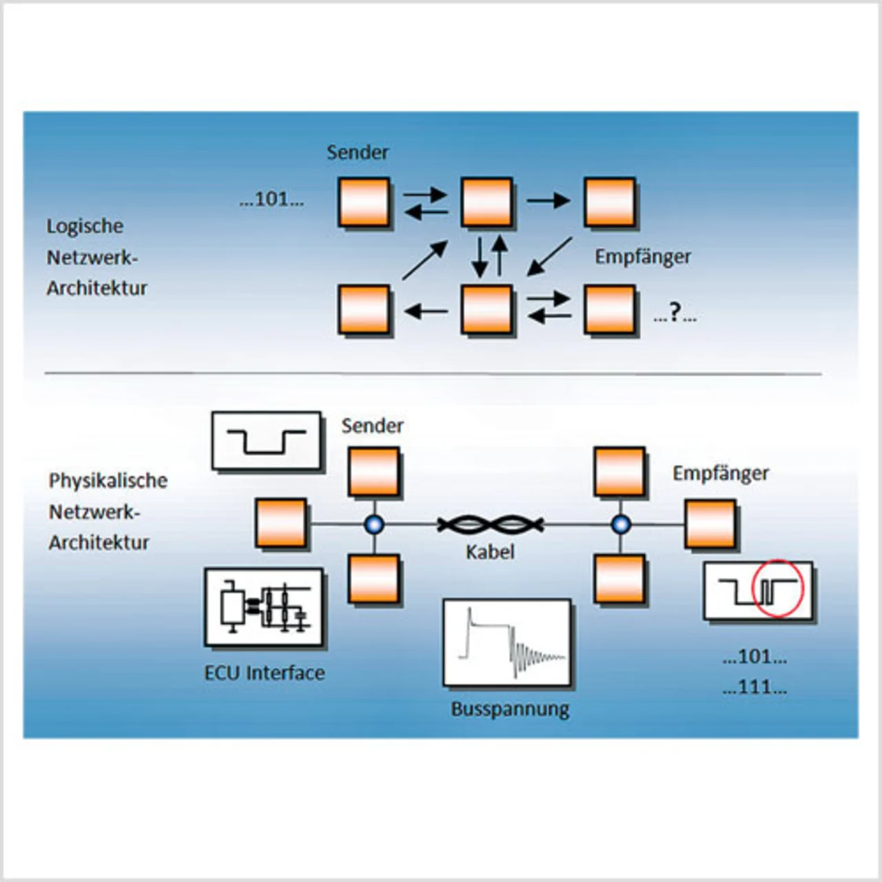 Diese Punkte sind besonders wichtig für eine korrekte Funktion des Netzwerkes. Dieser Aspekt wird durch die physikalische Netzwerkarchitektur beschrieben. Selbst wenn die logische Netzwerkarchitektur einwandfrei funktioniert, kann eine ungünstige Implementierung der physikalischen Schicht die Funktion des Netzwerkes erheblich negativ beeinflussen. Im schlimmsten Fall führt es dazu, dass die angestrebte Netzwerkarchitektur nicht realisierbar ist. Wenn ein Steuergerät (s. Bild 1) ein logisches Bit an die restlichen Steuergeräte aussendet, hängt die Signalform des an den anderen Steuergeräten (Empfängern) empfangenen Bits sehr stark von der Topologieform und den verbauten Komponenten ab. Im Gegensatz zu den idealen digitalen Übergängen der Controllersignale ist das Signalverhalten auf dem Bus, also zwischen den Steuergeräten, mit unerwünschten Oberwellen behaftet.