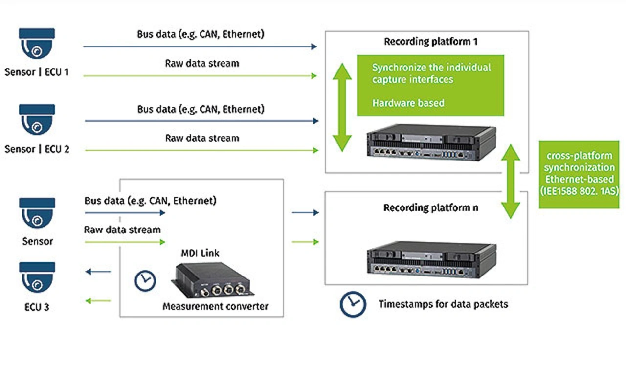 Betrachtet man einen Messaufbau in Fahrzeugen (Bild 1) mit mehreren Sensoren und Recordern, so ist die Synchronisation der Zeitquellen mittels IEEE 802.1AS über Ethernet eine adäquate Lösung, um flexible Konfigurationen zur realisieren. Dabei werden die Zeit von der Recording-Einheit als Master über das komplette Netzwerk aus Messdatenschnittstellen und Recordern verteilt und die Uhren synchron gehalten.