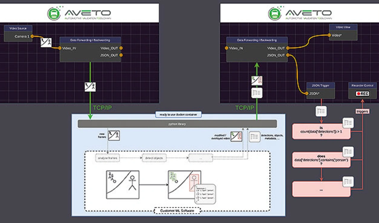 Bild 4 zeigt den logischen Ablauf des Datenflusses. Hierbei wird zusätzlich zur Datenrecorder-Plattform BRICK ein zweites Hochleistungssystem im Fahrzeug geschaltet, an das der zu analysierende Datenstrom gesendet wird. Dort wird dieser auf Basis von CPU und GPU bereits live während der Testfahrt innerhalb eines Docker Containers analysiert, es werden Objekte detektiert und die Metadaten generiert.
