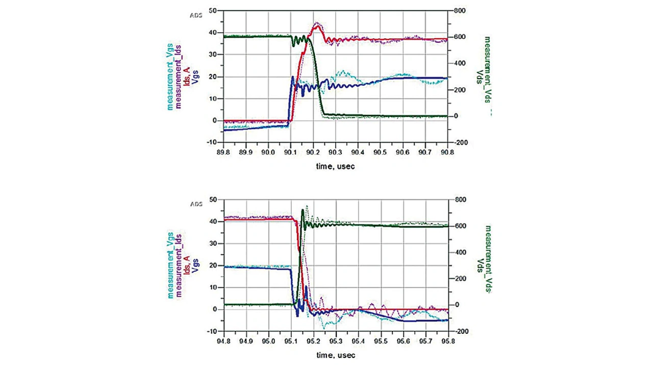 Halbleiterentwickler verwenden ein empirisches/mathematisches Modell mit Hochfrequenzcharakteristiken (S-Parameter-Messungen für »Null-Bias« und Ein-Zustand für das Schalttransistormodell) und Software zur Automatisierung des elektronischen Designs, um Bauelemente in Wandlerdesigns zu simulieren. Mit dieser Technik lässt sich die Übereinstimmung der simulierten Daten mit den Messdaten erheblich verbessern (Bild 4).