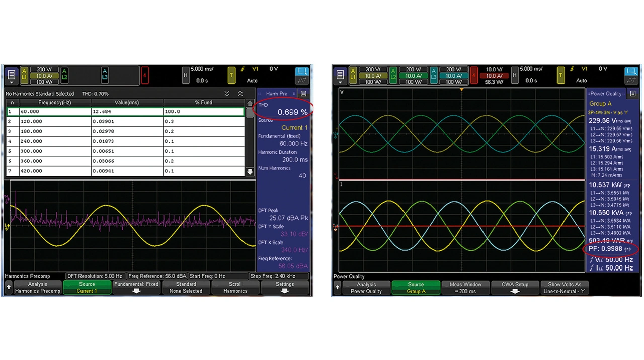 Die entscheidende Frage bei regenerativen Lösungen ist: Wie sauber ist der Strom, der in das Wechselstromnetz zurückgespeist wird? In der Fertigung verstärken die Testsysteme in der Einrichtung jede Verzerrung der in das Wechselstromnetz zurückgespeisten Leistung. Unsauberer Strom kann zu intermittierenden Problemen in der Einrichtung führen, sodass für jedes Testsystem ein Trenntransformator erforderlich ist, um das durch schlechte Rückspeisung verursachte Problem zu entschärfen. Es empfiehlt sich, beim Produktanbieter nachzufragen, ob die Rückspeisung in das Wechselstromnetz verzerrungsarm ist (Bild 6).