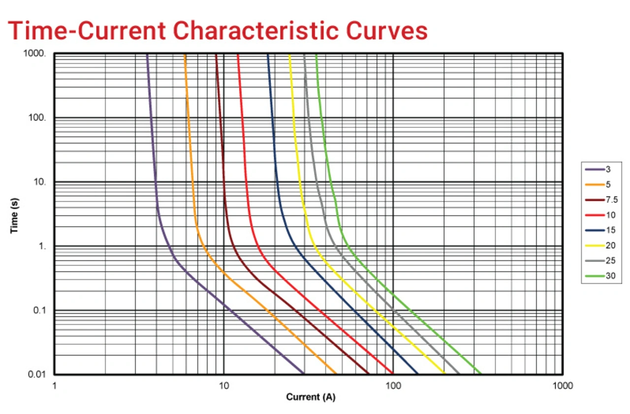 Herkömmliche Schmelzsicherungen schützen die angeschlossenen Verbraucher, indem sie bei zu hoher Stromstärke durchschmelzen und damit die elektrische Verbindung trennen. Das Ansprechverhalten wird durch so genannte Zeit-Strom-Diagramme veranschaulicht (Bild 2). Abhängig vom nominellen Strom, dem Betriebstemperaturbereich und anderen Faktoren kann der Nennstrom einer Sicherung beispielsweise um 25 % gemindert werden, um ein ungewolltes Ansprechen zu verhindern.
