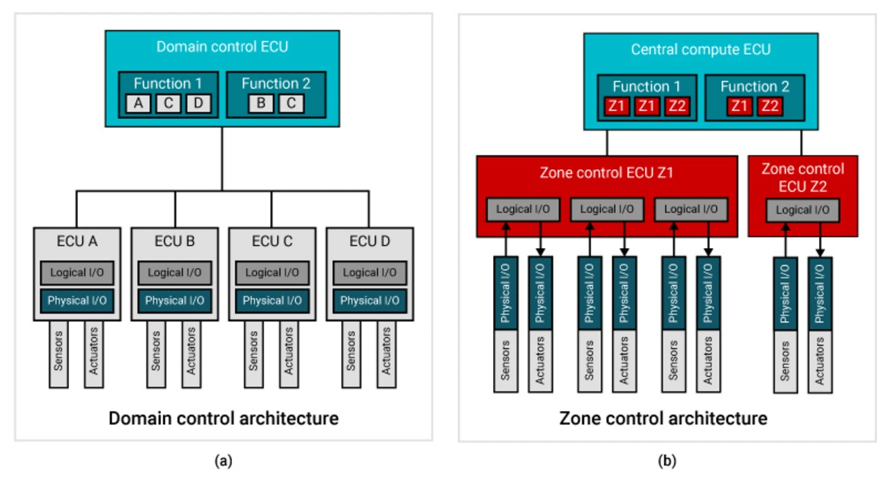 Die Elektrik und Elektronik heutiger Autos basiert meist auf einer Domänenarchitektur. Das heißt, dass elektronische Steuergeräte (Electronic Control Units, ECUs) und die zugehörige Verkabelung nach ihrer Funktion (beispielsweise Antriebsstrang, Karosserie, Komfort usw.) gegliedert sind. Im Gegensatz dazu werden bei der zonalen Architektur viele, wenn nicht gar alle Funktionen anhand ihrer physischen Lage im Fahrzeug unterteilt (Bild 1).