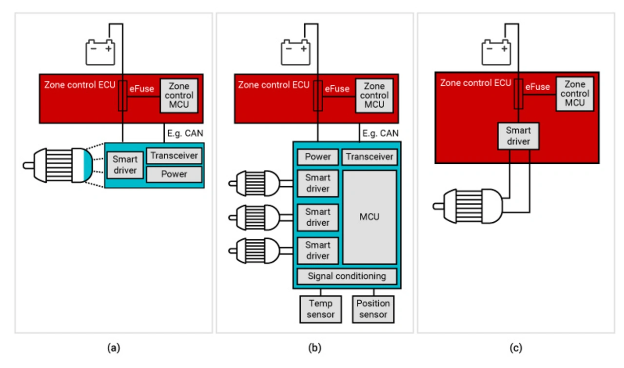 Eine Herausforderung ist das Design von Verteilerkästen, die in jeder Zone einsetzbar sind, denn dies vereinfacht das Design und die Lagerhaltung. Die Lösung sind intelligente Verteilerkästen mit Mikrocontrollern, High-Side-Schaltern und Transceivern, die sich per Software konfigurieren und an die Verbraucher der jeweiligen Zone anpassen lassen.