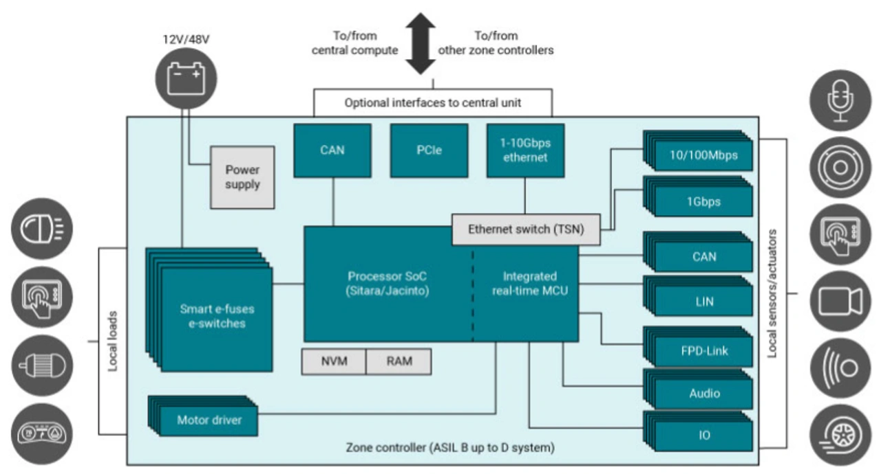 Die Mikrocontroller in den Zonenmodulen müssen die Anforderungen aller angeschlossenen I/O-Funktionen abdecken und deshalb über eine hohe Echtzeit-Performance, viel Programm- und Datenspeicher, schnelle Kommunikations-Schnittstellen zum Anschluss an den Backbone und mehrere Interfaces zum Anschließen der Sensoren und Aktoren verfügen. Nicht zuletzt müssen durch Virtualisierung Funktionen mit unterschiedlichen Safety Integrity Levels unterstützt werden.