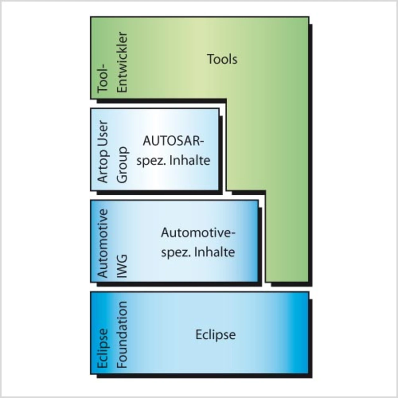 Mit Eclipse liegt eine derartige Plattform bereits vor, sie hat sich vielfach in der Entwicklung eingebetteter Systeme bewährt. Gegenwärtig ist jedoch im Automotive-Segment die Verwendung von Eclipse stark projekt- und unternehmensspezifisch. Durch den projektspezifischen Einsatz besteht noch keine einheitliche Vereinbarung über eine Grundmenge von Eclipse-Komponenten, auf die Werkzeuge aufgebaut werden können (Bild).