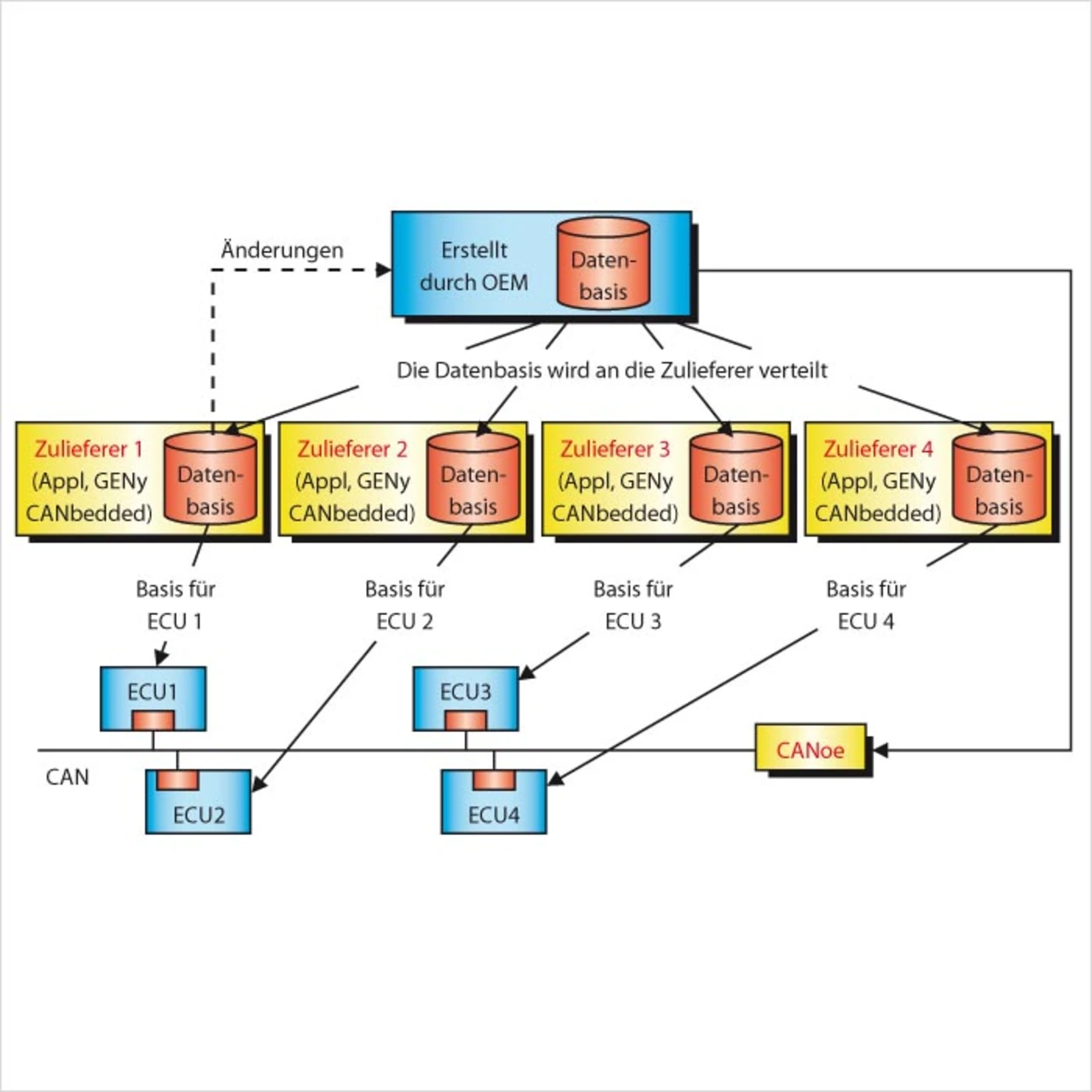 Zu schnellen Entwicklungsergebnissen führen die J1939-Software-Komponenten des Pakets CANbedded J1939. Sie entbinden die Entwickler zu einem Großteil von der Notwendigkeit, sich mit allen Details des J1939-Standards auseinanderzusetzen, und vermeiden Mehrfachentwicklungen. Im Mittelpunkt steht eine vom OEM verwaltete zentrale Datenbasis, in der alle elementaren Informationen der Steuergeräte-Kommunikation enthalten sind. Die Informationen werden – je nach Be-darf – an die beteiligten Partner verteilt, so dass sich eine flexible Arbeitsteilung zwischen OEM, den Netzwerkspezialisten von Vector sowie den Zulieferern ergibt (Bild 6). Letztere können mit dem Konfigurationswerkzeug GENy ihre spezifischen Einstellungen und Parametrierungen vornehmen. Das Ergebnis ist eine Reduzierung von Kosten und Zeit für Implementierung und Test, Kompatibilität auf dem CAN-Bus aufgrund einer unmissverständlichen Signalinterpretation und Integrität sowie auch Flexibilität im J1939-Kommunikations-Stack. Unterstützt werden alle relevanten Mikrocontroller bei geringem Bedarf an ROM- und RAM-Kapazität sowie mit hoher Laufzeiteffizienz. ha