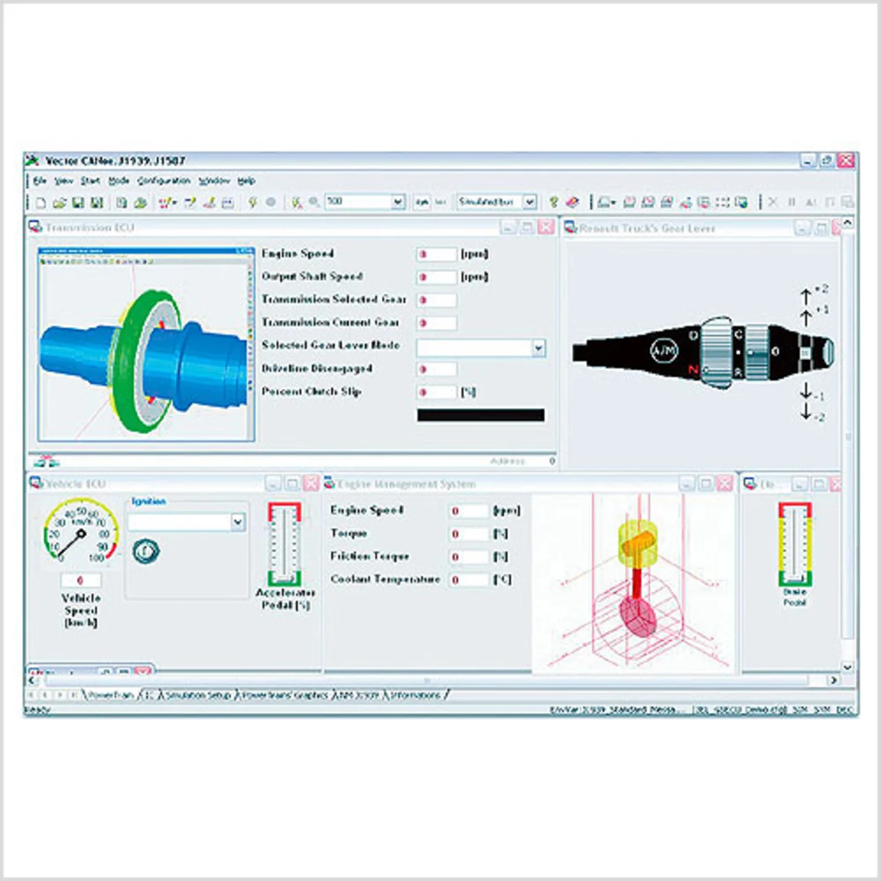 Normalerweise werden während der verschiedenen Nutzfahrzeug-Entwicklungsphasen verschiedene Funktionsmodelle für mechanische Komponenten wie Getriebe, Antriebsstrang oder sogar das komplette Fahrzeug erstellt. Steuergeräte-Architekturen bildet man zunächst in virtuellen Funktionsmodellen ab und realisiert sie Schritt für Schritt auf der endgültigen Hardware-Zielplattform. CANoe.J1939 integriert auch Matlab/ Simulink-Modelle in die Steuergeräte- und Netzwerk-Simulationen (Bild 5). Hierzu erzeugt der Anwender mit dem Real-Time Workshop von Mathworks eine *.DLL für CANoe, so dass Variablen-Namen und Units kompatibel sind.