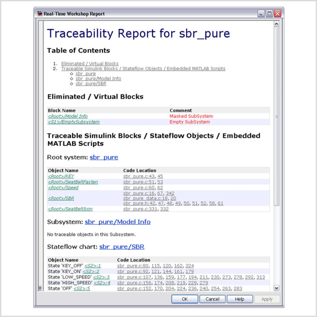 Im Laufe des Entwicklungsprozesses arbeiten die Ingenieure das Software-Designmodell zunehmend detaillierter aus, wobei sie es immer wieder verifizieren und validieren und damit gewährleisten, dass es die Anforderungen tatsächlich erfüllt. Aus Zustandsautomaten und Blockdiagrammen aufgebaute Modelle können mit Links ausgestattet werden, über die sich die in üblichen Requirements Management Tools niedergelegten Anforderungen bidirektional verfolgen lassen. Testfälle – sowohl per Hand definierte als auch automatisch erzeugte – können ebenfalls mit den Anforderungen verlinkt und so genutzt werden, um eine angemessene Abdeckung zu dokumentieren. In den späteren Entwicklungsphasen, also nach Erzeugung des target-spezifischen Produktionscodes aus dem Implementierungsmodell, sind im Real-Time Workshop Embedded Coder außerdem auf die Anforderungen bezogene Links zwischen den Programmanweisungen und dem Modell verfügbar. Industriestandards wie die IEC 61508 [4] oder Automotive SPICE [5] fordern diese ausgeprägte Rückverfolgbarkeit für die Entwicklung sicherheitskritischer Software.