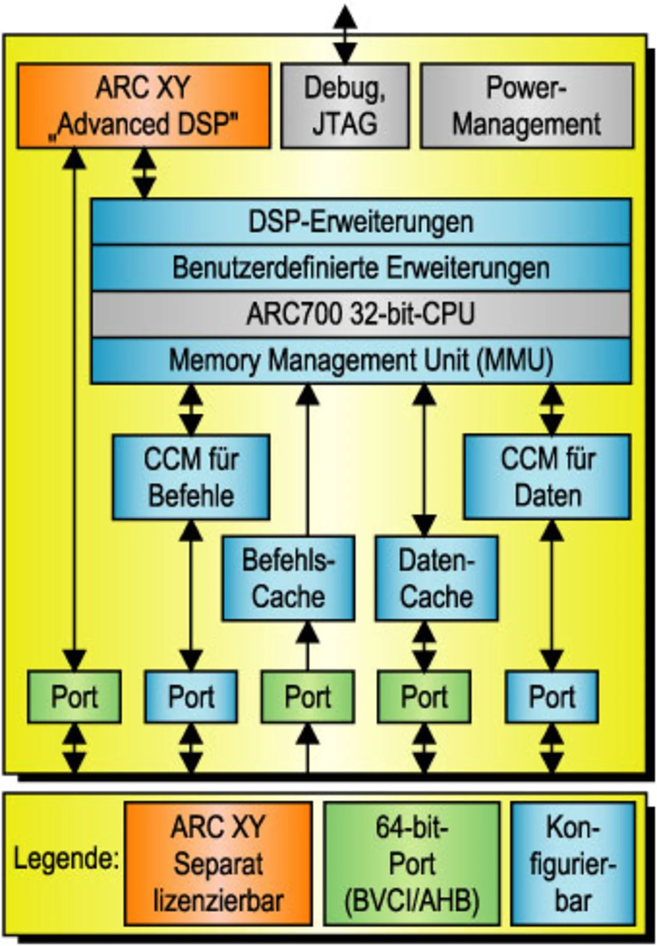 Der ARC-Core 750D (Bild 3) enthält Cache-Speicher sowie eine Memory Management Unit (MMU). Mit seiner höheren Verarbeitungsgeschwindigkeit ist er in der Lage, einen mit 533 MHz getakteten DDR-Speicher direkt zu bedienen, sodass er sich ideal als System-Host-Prozessor eignet, auf dem ein anspruchsvolles Betriebssystem wie beispielsweise Linux läuft. Ein derartiger Core kann beispielsweise in SoCs für Anwendungen wie PDAs, Information-Tablets, High-End-Media-Player und Settop-Boxen sowie in Telematik-Applikationen im Automobil zum Einsatz kommen.