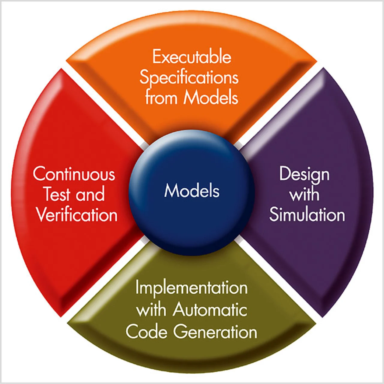 Abbildung 1 zeigt ein Schema des Model-Based Design: Im Zentrum der Gesamtentwicklung steht ein Modell, das als ausführbare Spezifikation dient, aus dem automatisch Programmcode generiert wird und das verifiziert und validiert werden kann.