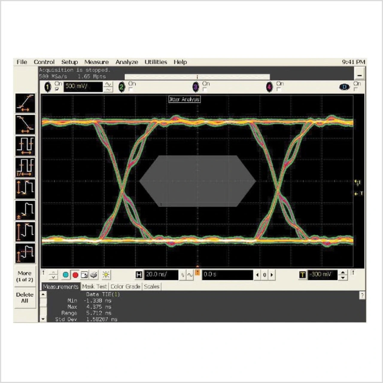 Nach der Erzeugung idealer BS-Ssynchroner Taktimpulse für die gesamte Aufzeichnung teilt das Oszilloskop die aufgenommenen Signale basierend auf den Taktimpulsen in Segmente von je einem Bit Länge auf. Die Bitsegmente der Nutzdaten (nur diese!) überlagert es dann auf dem Bildschirm und erzeugt so ein Echtzeit-Augendiagramm (Bild 3).