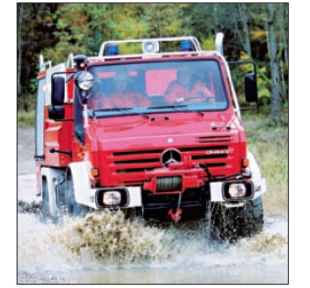 Die Produktlinie Unimog U3000/4000/5000 erreicht mit Portalachsen, Schraubfedern, zuschaltbarem Allradantrieb und Schubrohrtechnik eine extreme Geländegängigkeit, die durch eine Watfähigkeit bis 1,20 m ergänzt wird (Bild 1). Als Antrieb kommen emissionsarme Dieselmotoren mit Leistungen von 110 kW (150 PS) bis 160 kW (218 PS) zum Einsatz. Als Sonderausstattung bietet Mercedes-Benz unter anderem die Option „tirecontrol“ – eine elektropneumatische Anlage zur Reifenbefüllung und -entlüftung, die dem Fahrer erlaubt, vom Führerhaus aus den Reifendruck zu verändern.