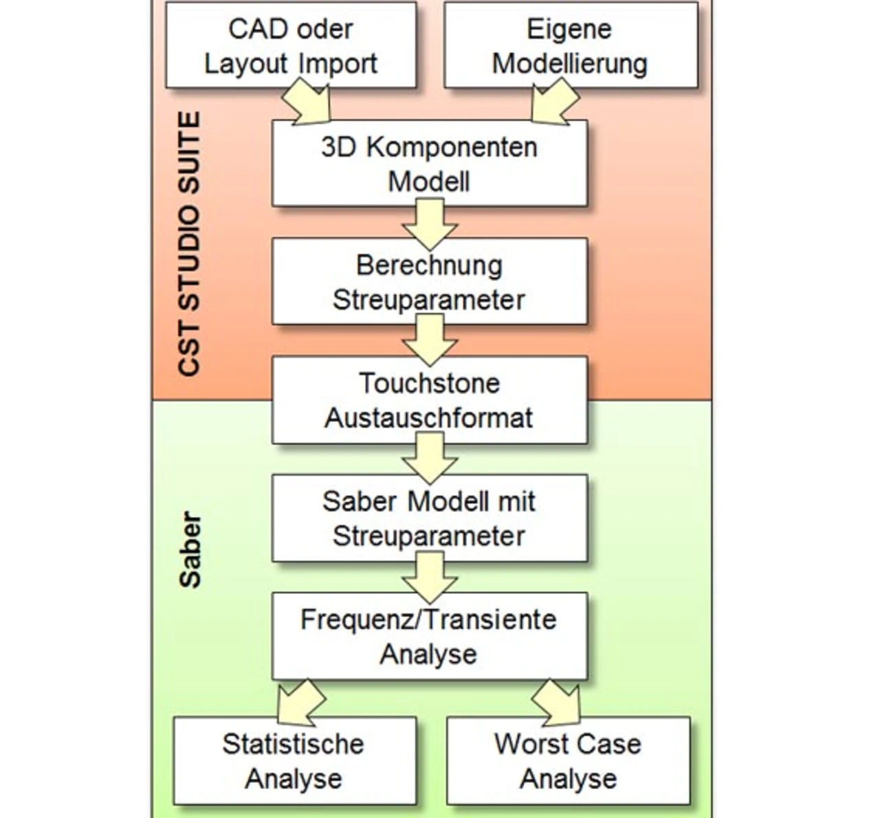 Zusätzlich verfügt Saber über eine umfangreiche Bibliothek von Modellen wie Leistungstransistoren oder IGBTs, die der Entwickler unmittelbar nutzen kann. Diese können mit den aus der Feldsimulation generierten EMV-Modellen kombiniert und simuliert werden. Um den Entwicklern eine nahtlose Verbindung zwischen Saber und der CST STUDIO SUITE bei der Integration der aus der Feldsimulation erstellten Modelle an die Hand zu geben, haben Synopsys und CST eine Schnittstelle entwickelt, die einen fast vollständig automatisierten Austausch der Modelle von CST STUDIO SUITE zu Saber ermöglicht (Bild 1). Der Datenaustausch basiert auf dem standardisierten Touchstone-Format für Streuparamater. Mit nur wenigen Klicks lassen sich in der CST STUDIO SUITE die Ergebnisse einer durchgeführten 3D-Feldsimulation exportieren. Der Export erzeugt automatisch alle Dateien, die für die Systemsimulation in Saber notwendig sind. Diese Dateien können beispielsweise per Drag & Drop in die Modellbibliothek von Saber importiert werden und stehen somit direkt für die anschließende Systemsimulation zur Verfügung