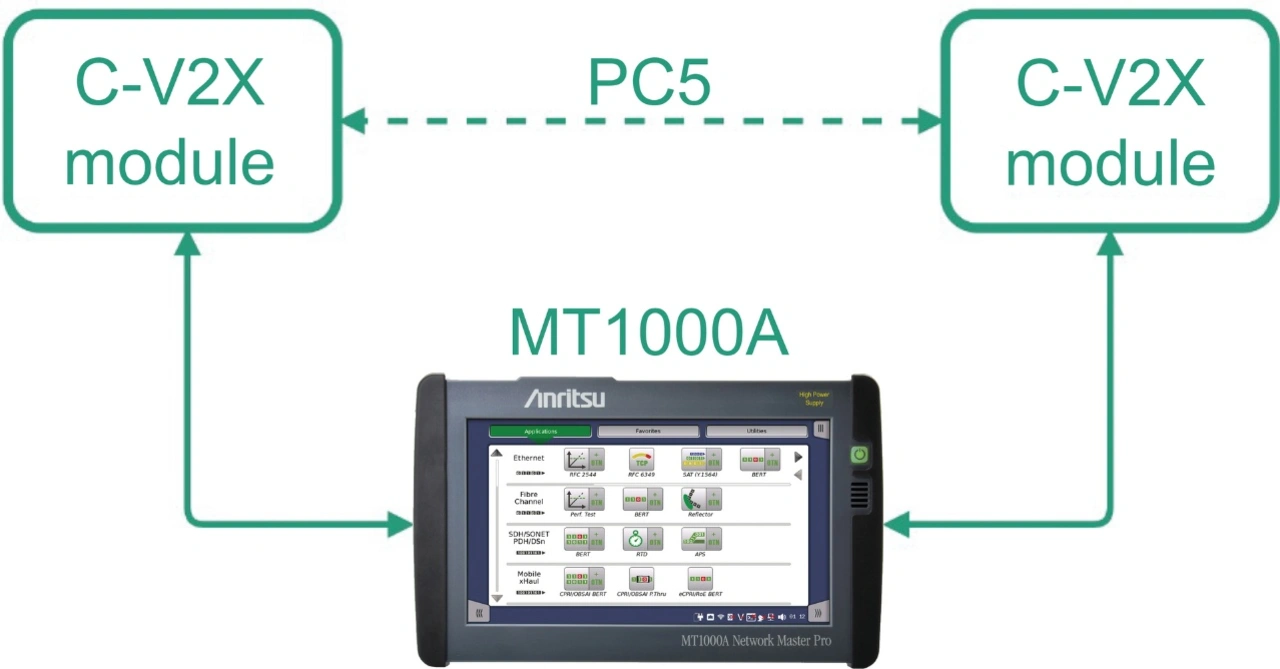 PC5-Latenzmessungen wurden mit dem in Bild 1 beschriebenen Testaufbau durchgeführt – mit einem MT1000A und zwei C-V2X-Modulen. In diesem Fall sendete jeweils nur ein Modul, während das andere empfing.
