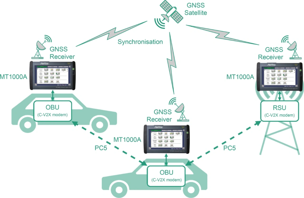 Dieser Versuchsaufbau lässt sich leicht für Feldtests anpassen, indem zwei oder mehr MT1000A-Einheiten verwendet werden. Bild 2 zeigt einen Aufbau, bei dem die Latenz zwischen On-Board Units (OBUs) und RSUs gemessen werden kann. Alle MT1000A-Einheiten sind über das GNSS-Signal zeitsynchronisiert, sodass sie an einem beliebigen Ort aufgestellt werden können und mobil sind.
