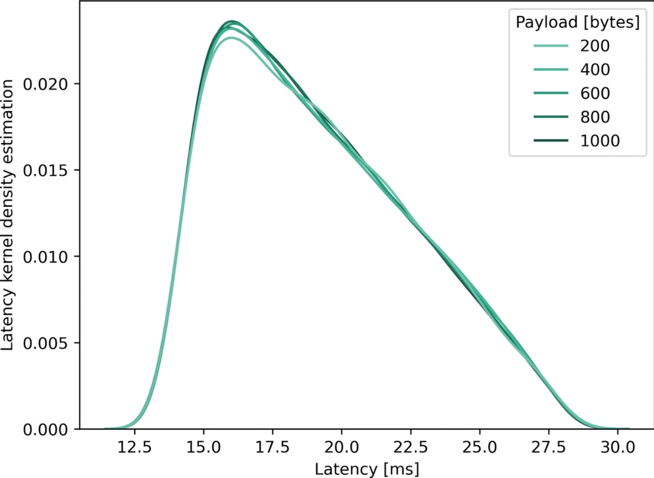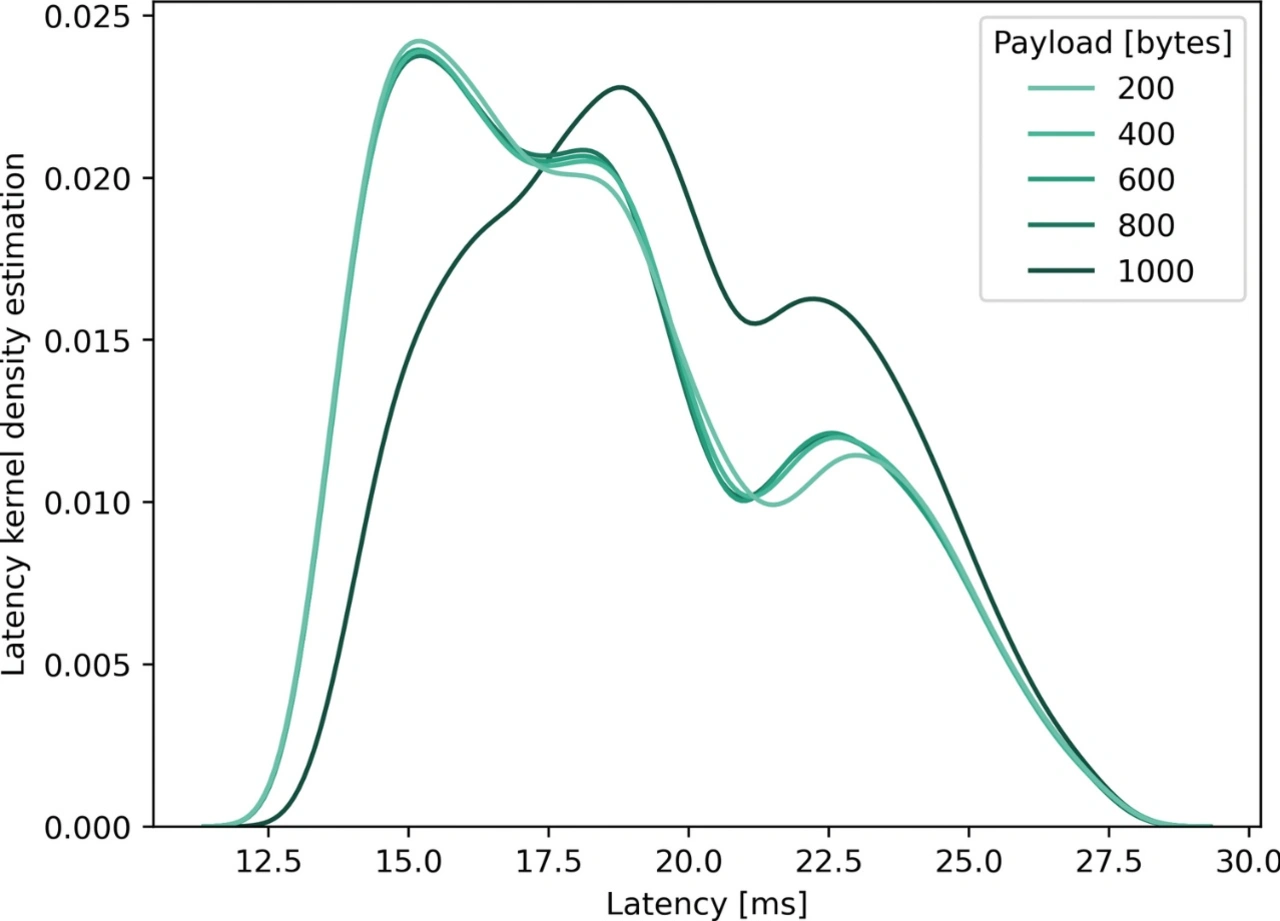 Ist die Paketerzeugung auf 100 PPS eingestellt, liegt die Latenz zwischen 12,9 und 27,8 ms, mit einem Durchschnitt von 18,6 ms für Nutzlastgrößen von 200 und 800 Byte. Die KDE ist in Bild 4 dargestellt und weist eine ausgeprägte positive Schiefe mit einem kleinen Tal bei 21 ms auf. Bei einer Nutzlastgröße von 1000 Byte liegt die Latenz zwischen 13,4 und 27,8 ms, mit einem Durchschnitt von 19,6 ms. Hier ist die KDE nicht so schief, weist aber immer noch ein kleines Tal bei 21 ms auf. Diese Täler werden durch die interne Geräteplanung verursacht.