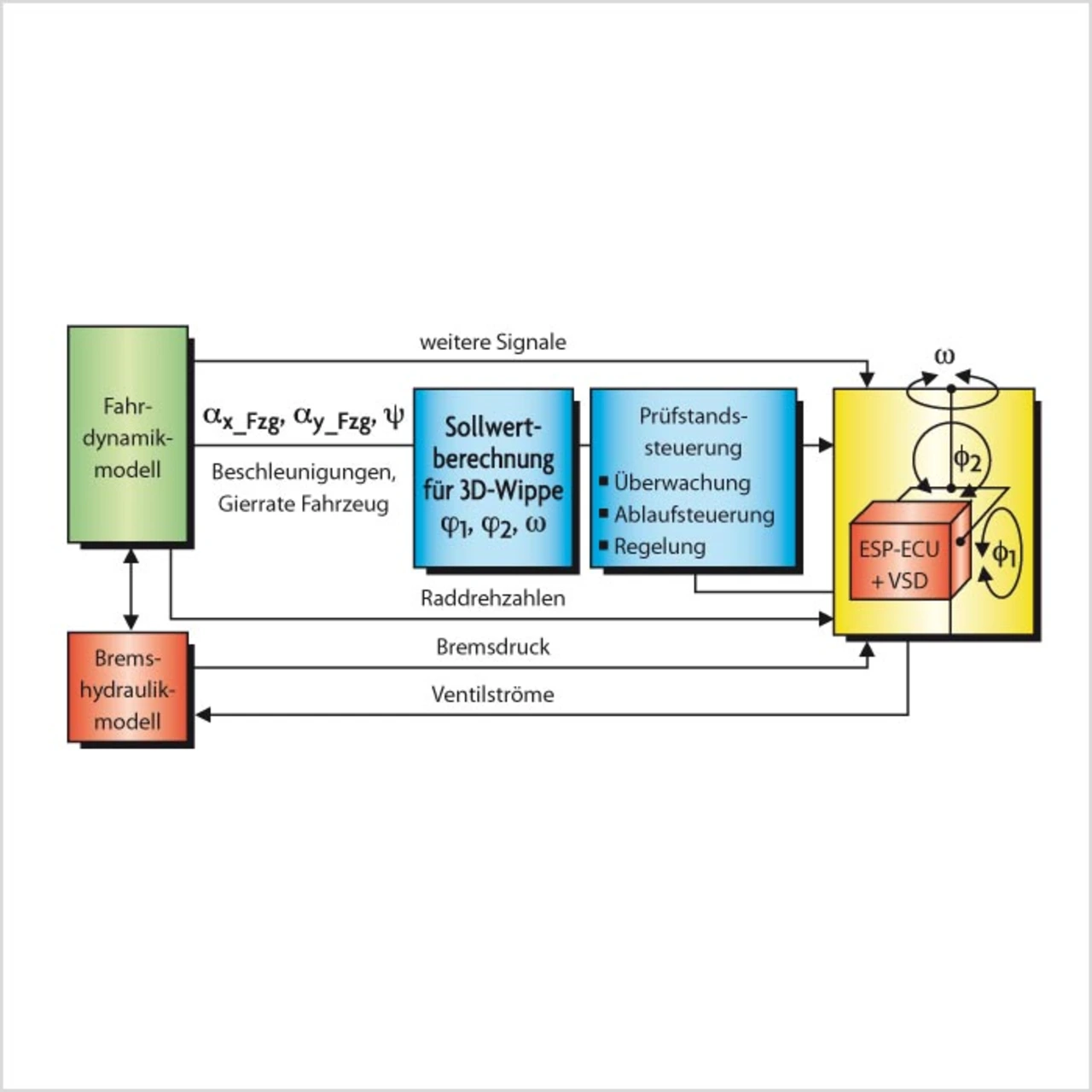 Die Lösung dieser Aufgabe besteht aus einer Mechanik, die das ESP-Steuergerät mit integriertem Sensor-Cluster entsprechend den gegebenen Freiheitsgraden um drei Achsen bewegt. Weiterhin ist eine Steuerung notwendig, die dem Fahrzeugmodell die aktuell zu simulierenden Beschleunigungen und Gierrate entnimmt und mittels einer geeigneten Transformation in entsprechende Sollwerte für die Freiheitsgrade der Bewegungsplattform umrechnet. Letztendlich sind passende, geregelte elektrische Antriebe notwendig, die die Bewegungen realisieren. Der grundsätzliche Ablauf ist Bild 3 zu entnehmen.