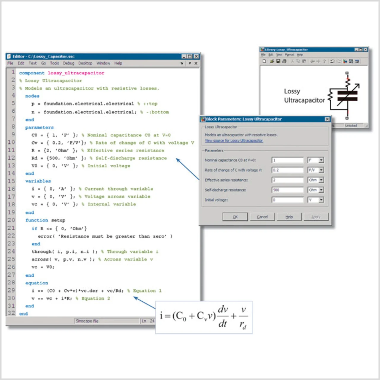 Die Simscape Language ist eine Matlab-basierte Sprache für die Definition physikalischer Modellierungsdomänen und für die Entwicklung physikalischer Komponenten. Sie beschreibt Beziehungen zwischen Komponenten und ist als objektorientierte Sprache darauf ausgerichtet, dass der Code wiederverwendet werden kann. Der Entwickler beschreibt die jeweiligen Parameter; die Benutzerschnittstelle und der Simulink-Block werden automatisch erstellt. Für die Beschreibung des Systems sind nur die Gleichungen nötig – es ist egal, mit welchen anderen Komponenten das System zusammenarbeitet.