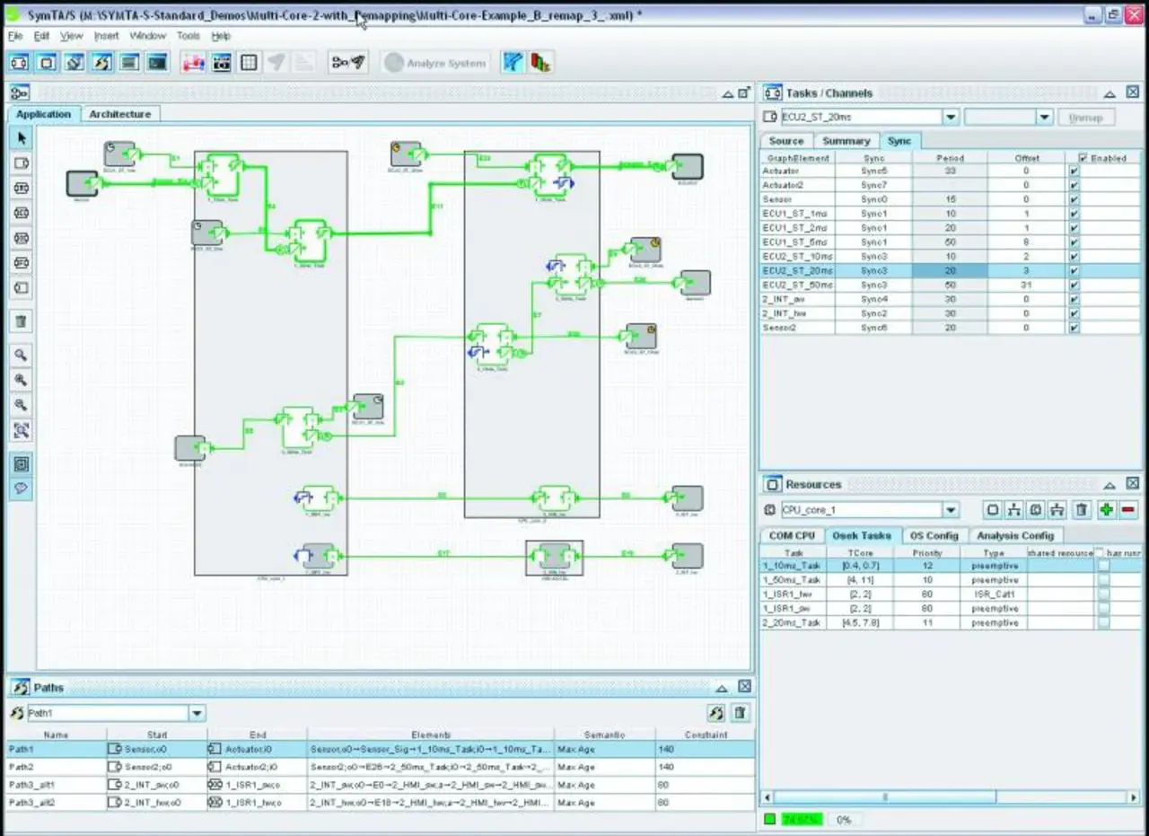 Die Timing-Analysen sollten das Vermeiden von Überlastsituationen auf den CPUs garantieren und die maximalen Laufzeiten zweier kritischer Signale absichern. Dabei handelt es sich um End-to-End-Wirkketten über Prozessorgrenzen hinweg (in Bild 2 farblich hervorgehoben). Die beiden Signalwege sind Teil einer Dual-Path- Strategy mit einem „Primary“- und einem „Secondary“-Signalweg, mit der GM sicherheitskritische Teile der Anwendung nach dem Redundanzprinzip doppelt absichert. Die zulässige Obergrenze für die Signalverzögerung liegt jeweils bei 100 ms. Hinzu kommt eine weitere Echtzeit-Anforderung: Beide Berechnungen müssen möglichst zeitgleich beendet sein, die Differenz der Verzögerungen darf nicht mehr als 10 ms betragen. Dabei muss auch der Signal-Jitter berücksichtigt werden. Zunächst wurden die Informationen aus dem bestehenden Funktionsmodell und dem Architekturmodell in ein initiales SymTA/S-Modell überführt (Schritt #0 in Bild 3). Zusammen mit den Laufzeitinformationen der einzelnen Funktionen entstand daraus das SymTA/S-Modell für die Analyse (Schritt #1). Die Analyseergebnisse von SymTA/S wurden als Grundlage für weitere Optimierungen (Schritt #2) verwendet. Abschließend wurden die Ergebnisse mit einem GMIn- House-Werkzeug für die statistische Auswertung (Schritt #3) überprüft. Das Einbetten von SymTA/S in diesen Prozess war durch die Vielzahl von Import/Export-Schnittstellen von SymTA/S und die Möglichkeit der Steuerung über Skripte problemlos möglich.