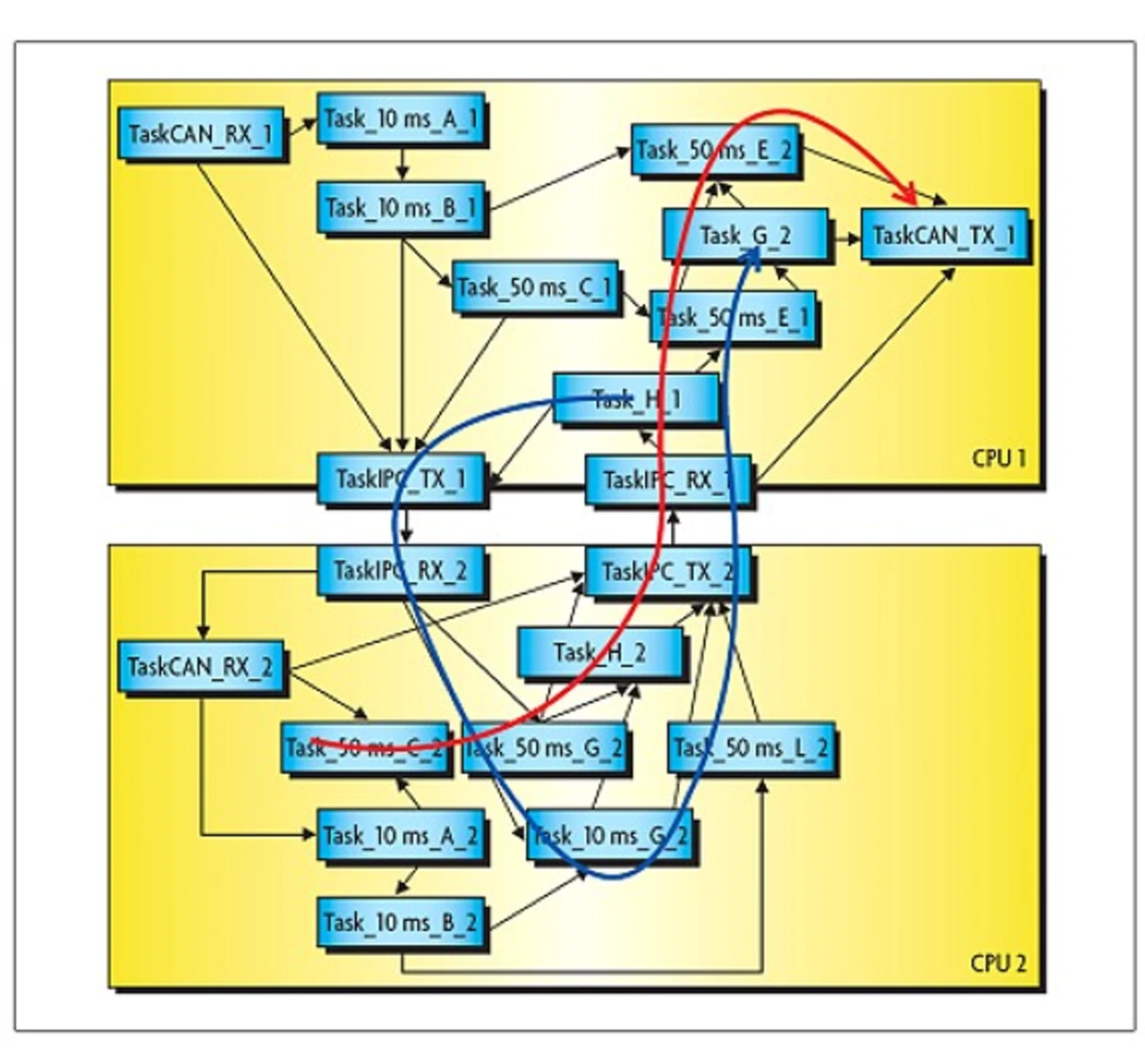 Auf der Symtavision NewsConference im Oktober 2009 stellte Paolo Giusto detailliert dar, wie General Motors’ Voraus- und Serienentwicklung beim SymTA/S-basierten Entwurf des neuen „Dual-Processor Active Safety Module“ kooperierten. Das System besteht aus gut 20 Tasks mit insgesamt über 1000 Funktionen (Bild 2). Es ist ein Multi-Raten-System, d.h., es laufen Tasks und Funktionen in unterschiedlichen Rastern, die zum Teil miteinander synchronisiert sind. Hinzu kommen ereignisgesteuerte Tasks. Das Scheduling verläuft nach OSEK mit statischen Prioritäten und einer Kombination aus preemptivem und kooperativem Scheduling. Es ist eine periodische Inter- Processor-Communication (IPC) eingerichtet, um Konflikte auf dem gemeinsam genutzten Speicher zu minimieren. Die Anbindung an den CANBus ist auf CPU1 realisiert, dabei sind kritische Sende-Nachrichten mit dem Task-Schedule synchronisiert, sonst ist die Anbindung asynchron.