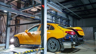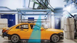 Die technische Sensation beginnt mit einem sehr lauten Knall. Mit 60 km/h rammt eine Vorrichtung mit Stoßbarriere die orangefarbene C-Klasse-Limousine und trifft sie voll in der Seite: ein lauter Knall. Crashtests sind immer etwas Besonderes – auch für die Experten. Aber das wirklich Spektakuläre sitzt bei diesem Seitenaufprall-Versuch in einem Gestell an der Hallendecke über dem Fahrzeug: Ein Linearbeschleuniger dient als Röntgenquelle.