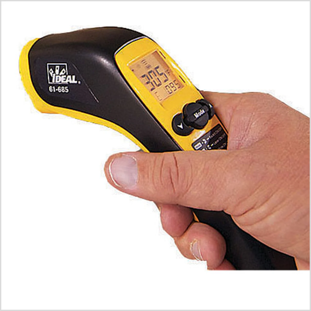 Infrarot-Handheld-Thermometer zum Messen von Oberflächentemperaturen sind nichts Neues; aber ein Messbereich von –64 bis max. 500 °C (–64 bis 1400 °C mit angeschlossenen Typ-KThermoelementen) und die Möglichkeit der Aufzeichnung eines Temperaturverlaufes in einem so kompakten Pistolengehäuse wie beim IR-Thermometer 61-685 sind doch beachtlich, denn derartige Eigenschaften wurden bislang nur von teureren stationären Geräten geboten. Hergestellt wird das Messgerät (Bild 4) von Ideal Industries (www.idealindustries.de), es erzeugt auch einen Laserpunkt zur Lokalisierung des Messfeldes. Der für unterschiedliche Materialien einstellbare Emissionsgrad erhöht die Genauigkeit der Ergebnisse bei der Messung an reflektierenden und nicht-reflektierenden Oberflächen. Maximal-, Minimal-, Differenz- und Durchschnittstemperatur-Ergebnisse werden innerhalb einer Sekunde am hintergrundbeleuchteten Display mit einer Auflösung von 0,1 K angezeigt. Zusätzlichkann der Anwender für hohe und niedrige Temperaturpunkte eine akustische Warnung aktivieren. Während einer Messung lässt sich der „Lock-Mode“ aktivieren; dabei wird die Temperaturentwicklung bis zu 60 Minuten lang erfasst und aufgezeichnet. Ausgestattet mit einer Buchse für den Anschluss von Typ-K-Thermoelementen, lässt sich das IR-Thermometer auch an schwer zugänglichen Stellen verwenden. In der Bedienungsanleitung sind auch die Emissionsgrade für gängige Materialien wie Kupfer, Eisen, Papier oder auch Schnee aufgelistet.