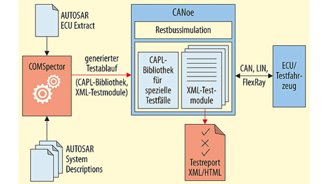 Mit der neuen Vernetzungstopologie führte Daimler ein AUTOSAR-konformes Netzwerkmanagement ein. Die noch fehlende Unterstützung für AUTOSAR-Standards, FlexRay und neue Datenbankformate waren unter anderem Gründe dafür, 2011 eine Neuentwicklung des Inhouse Tool in Angriff zu nehmen. Angesichts der umfangreichen Anpassungsarbeiten und Wartungsaufwände beschloss die Entwicklungsabteilung am Standort Sindelfingen, das Projekt auszulagern, und beauftragte Vector Informatik mit der Neu- und Weiterentwicklung. Der neue Netzwerktest-Generator „COMSpector“ deckt mit einem signifikant erweiterten Funktionsumfang deutlich mehr Testfälle ab und basiert – wie schon das Vorgänger-Tool – auf CANoe. Letzteres stellt über die Erweiterung Test Feature Set (TFS) zahlreiche Funktionen zum automatischen Testen von Steuergeräten bereit. Das Werkzeug beherrscht unter anderem Restbussimulationen, spielt aufgezeichnete Trace-Daten ab und verfügt über einen Reportgenerator zum Erstellen ausführlicher Testreports (Bild 1). Automatische Testabläufe und Netzknotensimulationen lassen sich in der Skriptsprache CAPL mit C-ähnlicher Syntax kodieren. Weil CANoe im Hause Daimler schon seit Langem erfolgreich im Einsatz ist, integriert sich COMSpector nahtlos in die vorhandene Werkzeugkette.