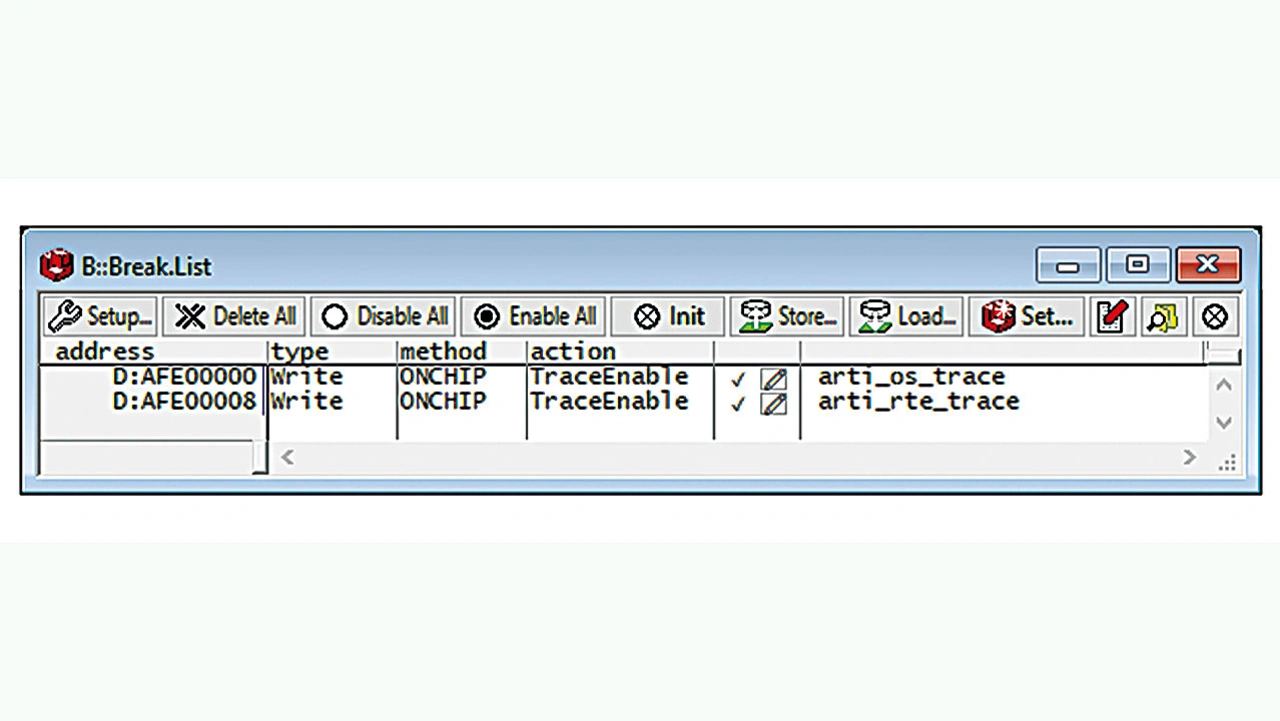 In der Folge hat Lauterbach im Interesse von ZF ab März 2022 mit ASTC zusammengearbeitet, um den fehlenden Daten-Trace zu implementieren sowie die Inkonsistenzen der MCD-API zu beseitigen. Im August 2022 war das überarbeitete Modell von ASTC inklusive Daten-Trace fertig. Bild 5 zeigt exemplarisch die Konfiguration zur Aufzeichnung von Variablen mit Lauterbachs PowerView-Software.