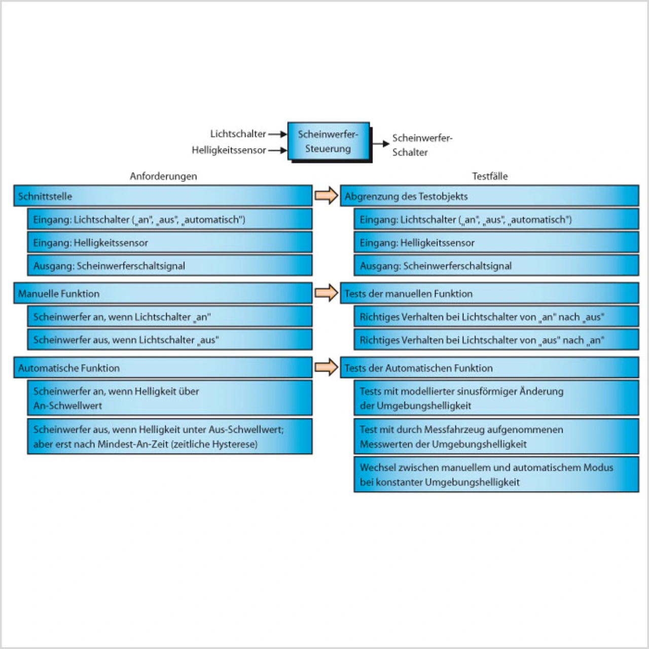 Im Folgenden wird anhand eines Beispiels aus der C-Klasse-Entwicklung der praktische Einsatz von TPT erläutert. Hierbei handelt es sich um eine Scheinwerfersteuerung, die wahlweise manuell oder automatisch (gesteuert durch einen Helligkeitssensor) arbeiten kann. Bild 2 zeigt eine Auswahl der Anforderungen an die Steuerung und die daraus abgeleiteten Testfälle. Ein Testingenieur, der die Testfälle implementiert, würde die folgenden Schritte durchführen.