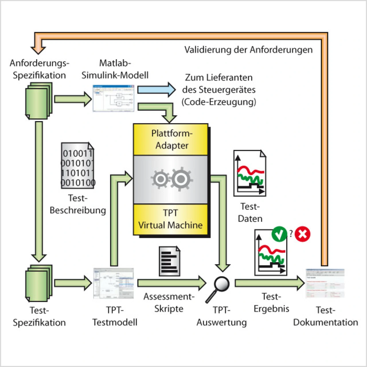 Bild 1 verdeutlicht den Entwicklungsprozess. Die Erstellung der Steuergeräte- Software beginnt mit der Entwicklung eines Matlab/Simulink- Modells auf Basis der Anforderungsspezifikation. Daraus wird die Testspezifikation abgeleitet und ein Modell- Testsystem auf Basis von TPT erstellt. Fertig gestellte Funktionsmodelle werden an den Zulieferer übergeben. Dieser erzeugt aus den Funktionsmodellen mit Hilfe automatischer Code-Generatoren produktionstauglichen C-Code und sorgt für dessen Implementierung auf dem Steuergerät. Die Implementierung wird beim Zulieferer mit TPT verifiziert (Software-inthe- Loop), um mögliche Implementierungsfehler aufzudecken. Über mehrere Zyklen wird schließlich ein stabiler Release-Stand erreicht.